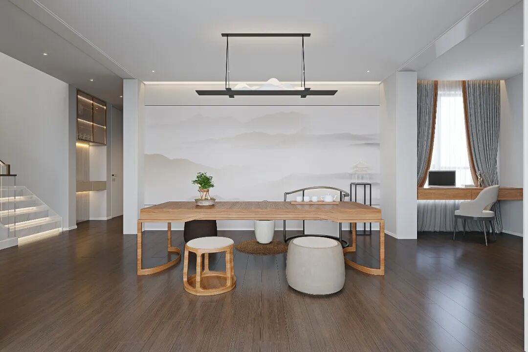 茶室面向着窗外秀丽的风光,与背后的山水画相互呼应。独特的吊灯设计,增加了丝丝“禅意”。