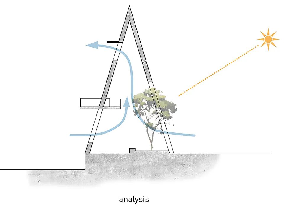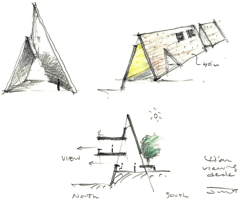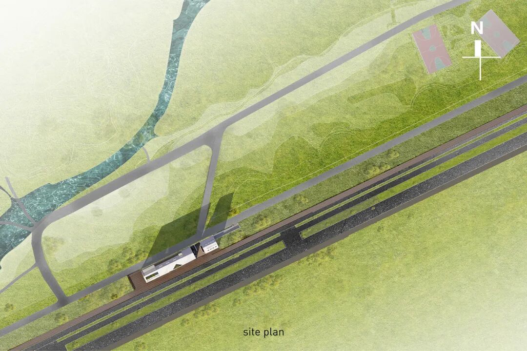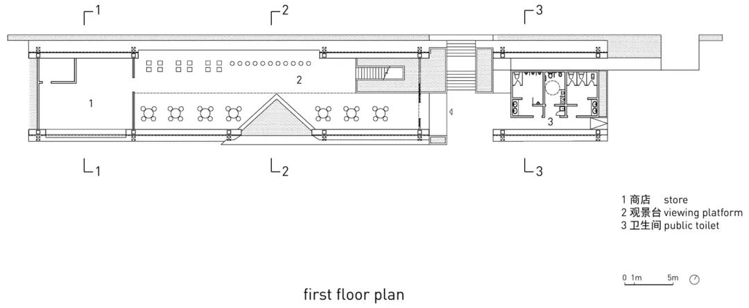 建筑包括三个功能,两层的开放式观景台,微型商店,以及独立的公共卫生间,让人们在河滨运动游憩之余可歇留赏景。观景台南北通透,东西格栅为界,向北观渭河滔滔,向南赏都市农田景观、远处的高铁高架桥及城市的轮廓。花坛作为观景台的一部分与河岸的林木相映。