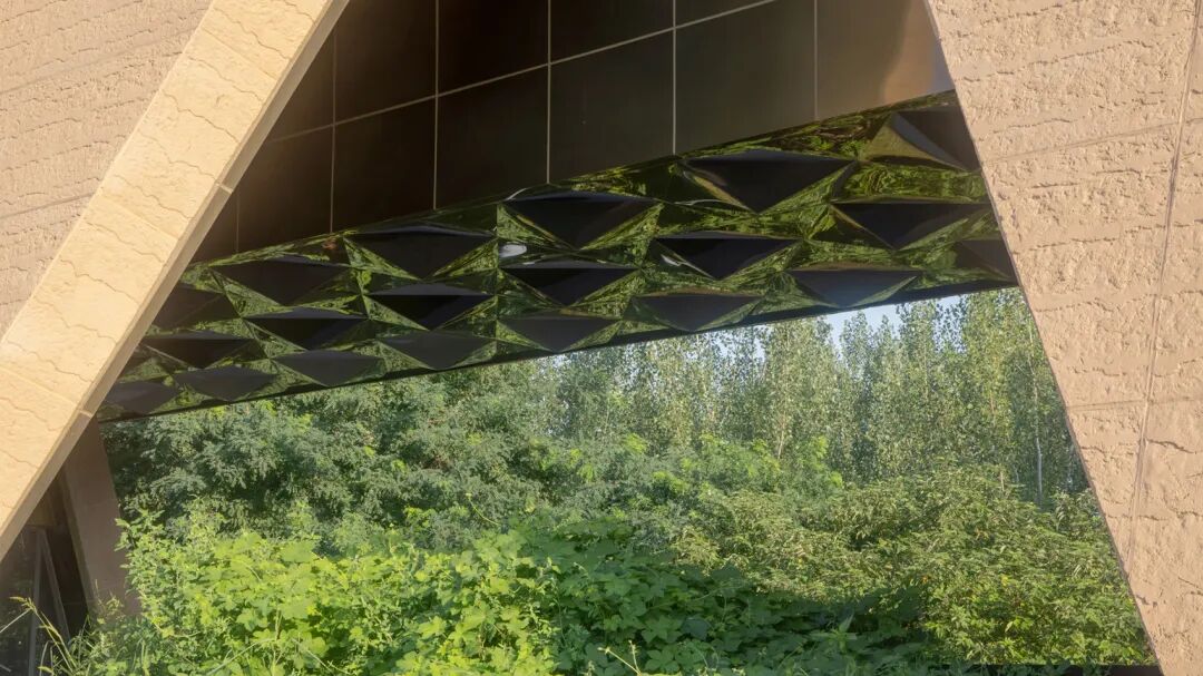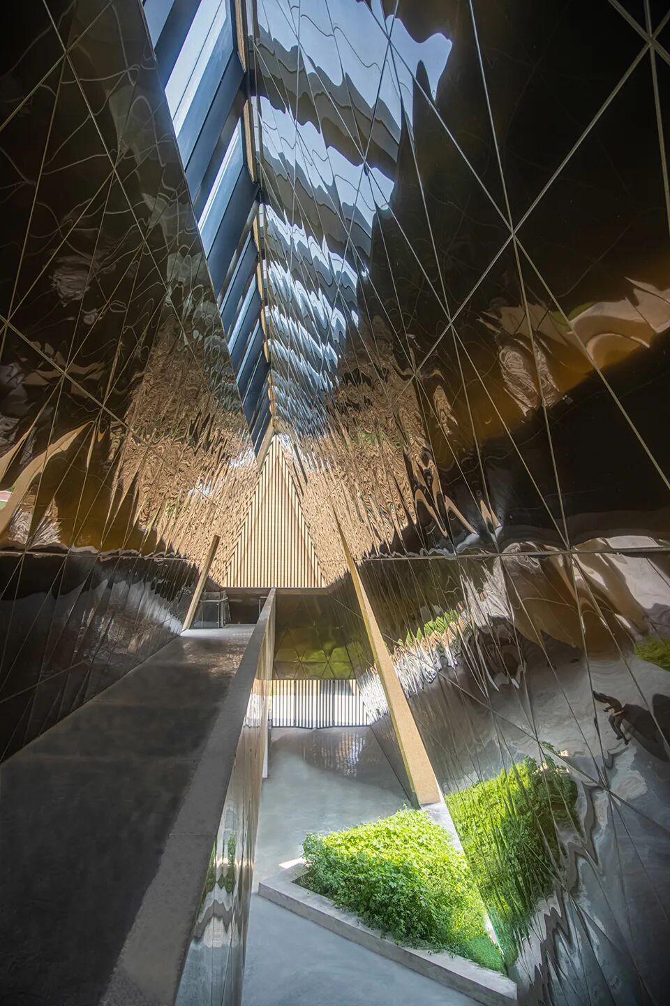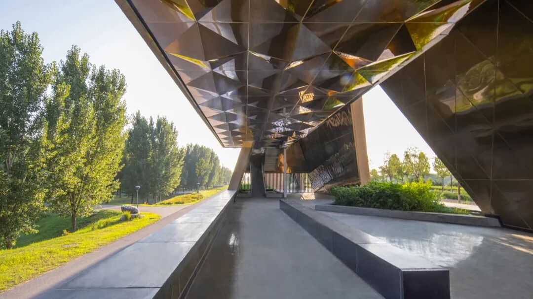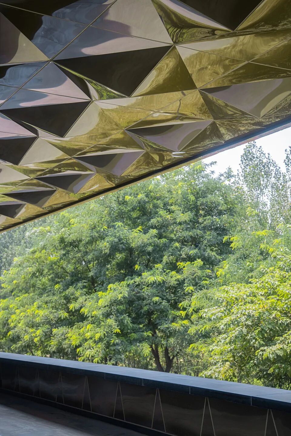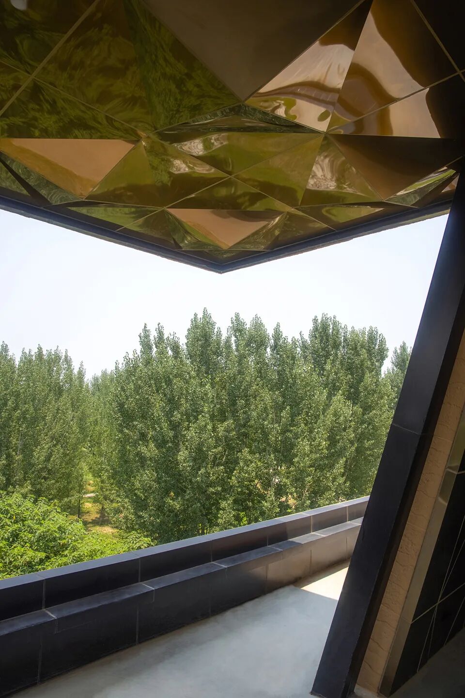 简约异质的造型在生态区极具标志感,自成风景。建筑外表皮采用夯土纹理板,呼应当地风土文脉和经验性肌理。内表皮则以不锈钢铜板为面,一则保持与夯土的统一色调,二则以这一现代的材料作为空间感知上的反差强调人们对现代身份的认同,三则藉其金属的光泽,和光对话,将景观影入内部,以“波光涟漪”呼应渭水东流和风中幻景。内表皮统一的铜板随着屋檐伸出,虚化建筑的内外界面,消融古今沧桑。