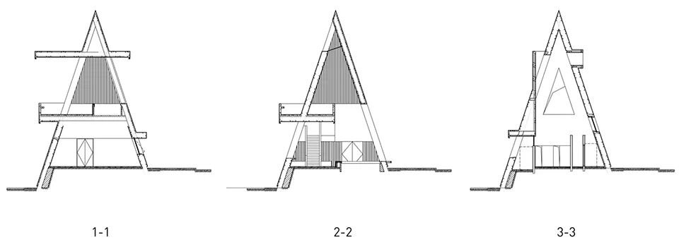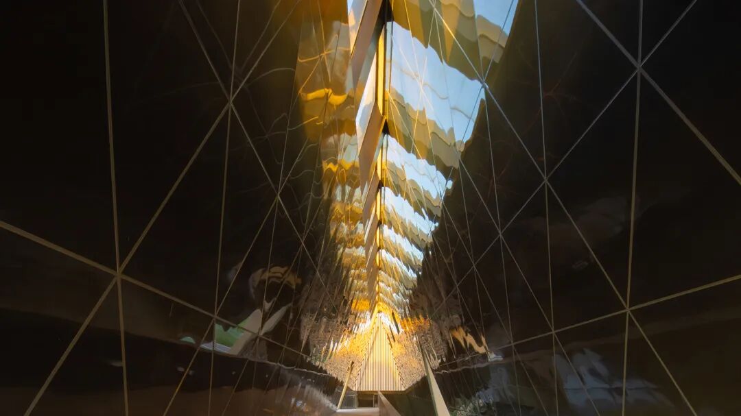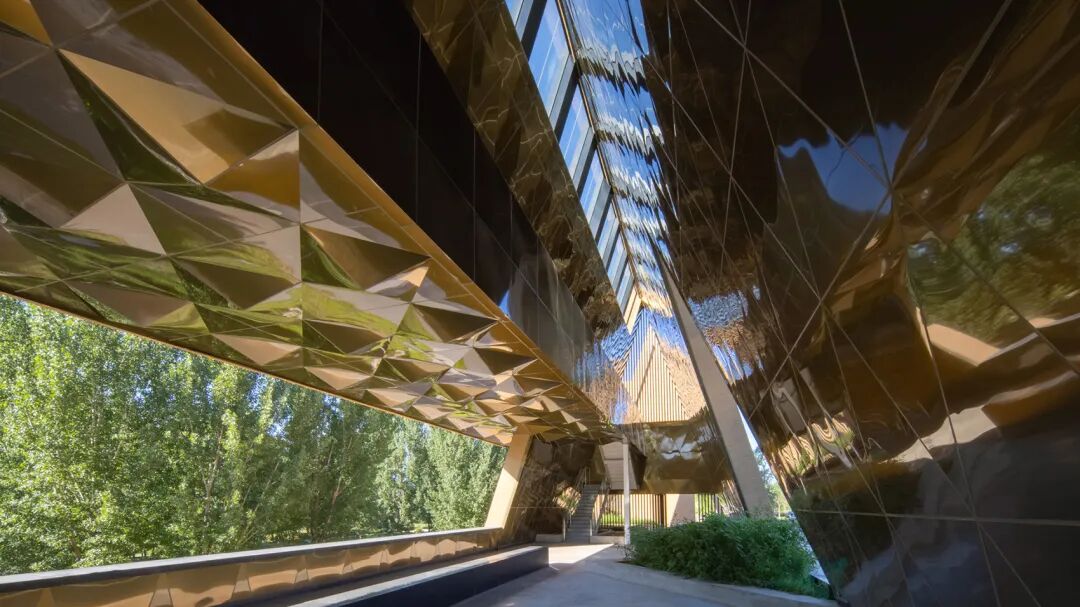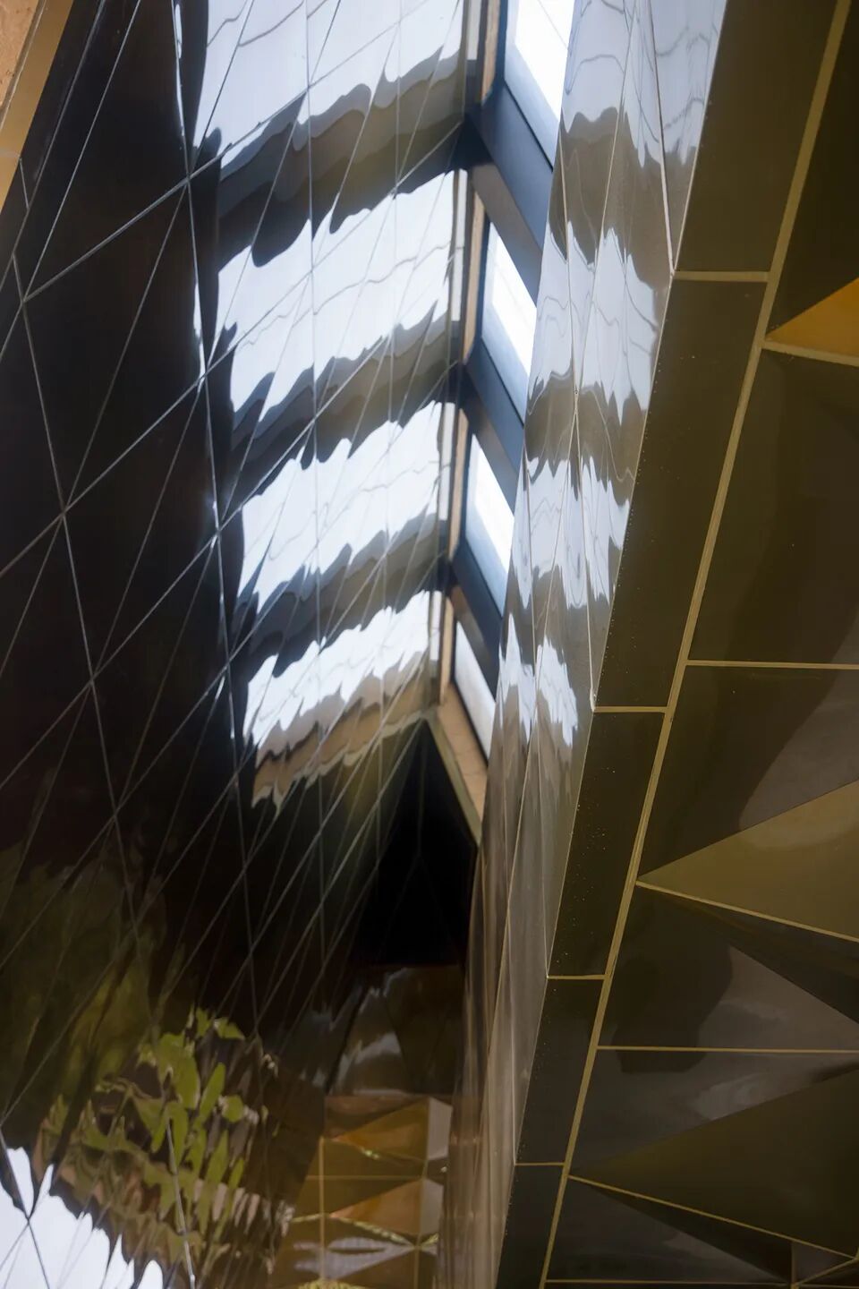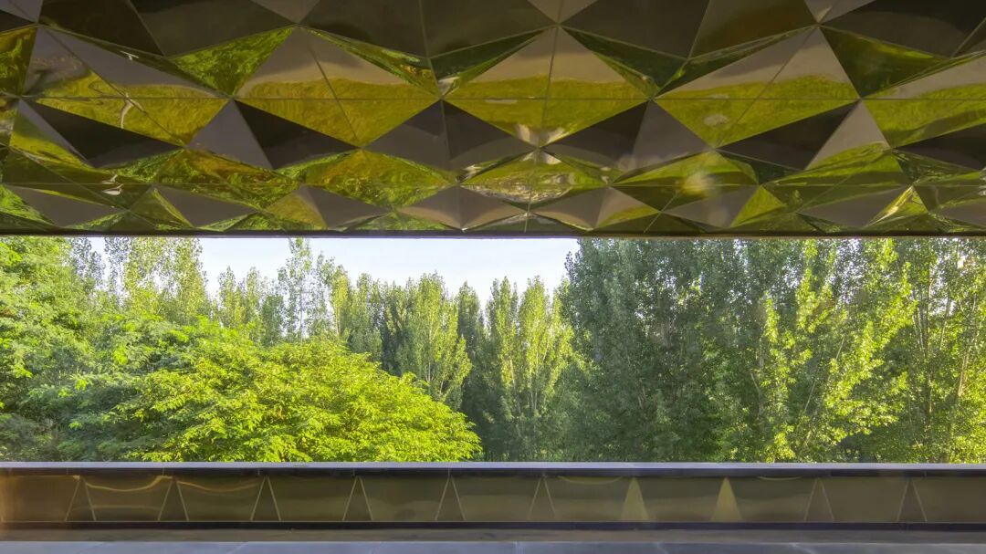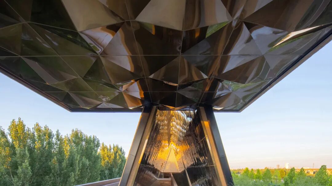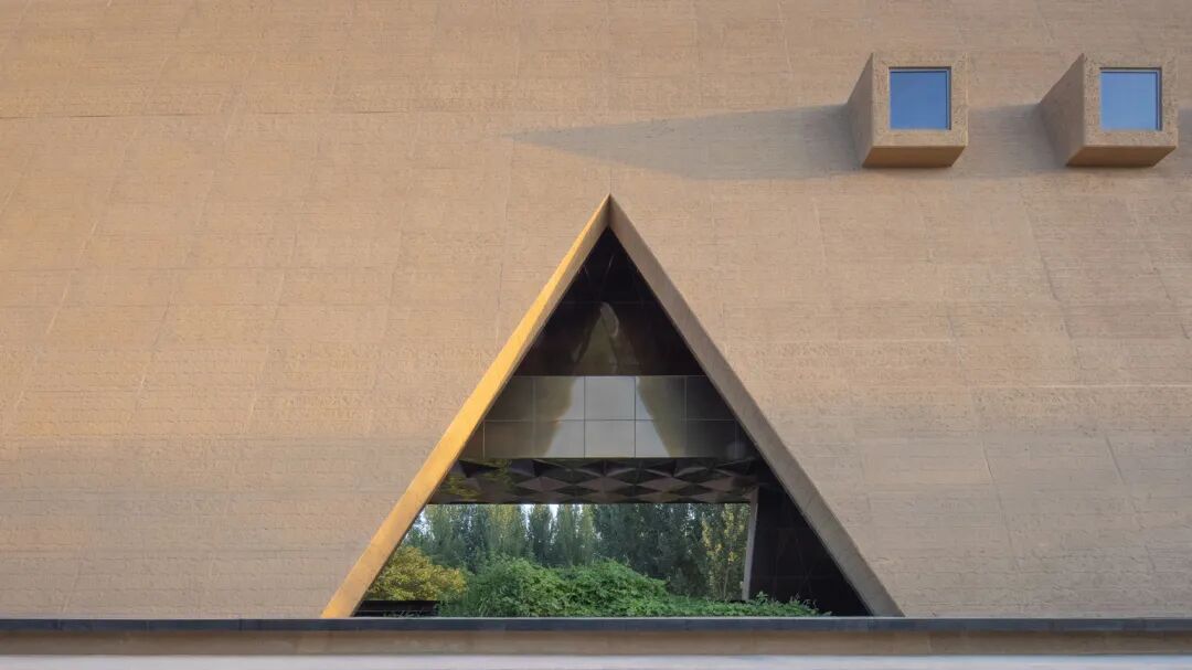简约异质的造型在生态区极具标志感,自成风景。建筑外表皮采用夯土纹理板,呼应当地风土文脉和经验性肌理。内表皮则以不锈钢铜板为面,一则保持与夯土的统一色调,二则以这一现代的材料作为空间感知上的反差强调人们对现代身份的认同,三则藉其金属的光泽,和光对话,将景观影入内部,以“波光涟漪”呼应渭水东流和风中幻景。内表皮统一的铜板随着屋檐伸出,虚化建筑的内外界面,消融古今沧桑。