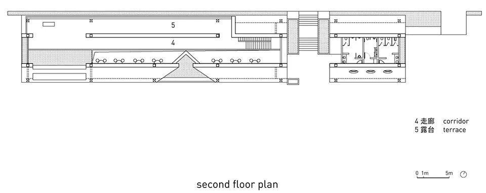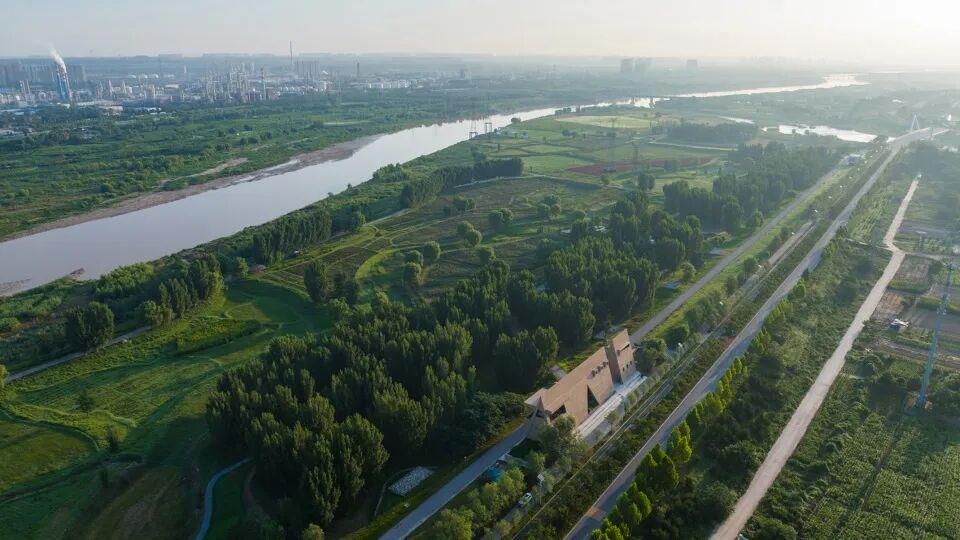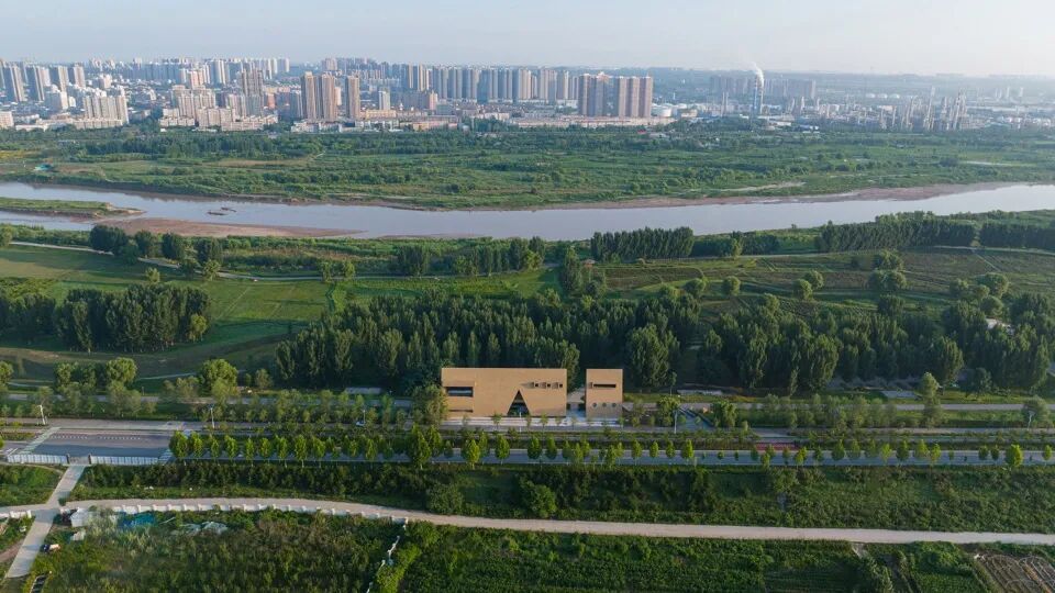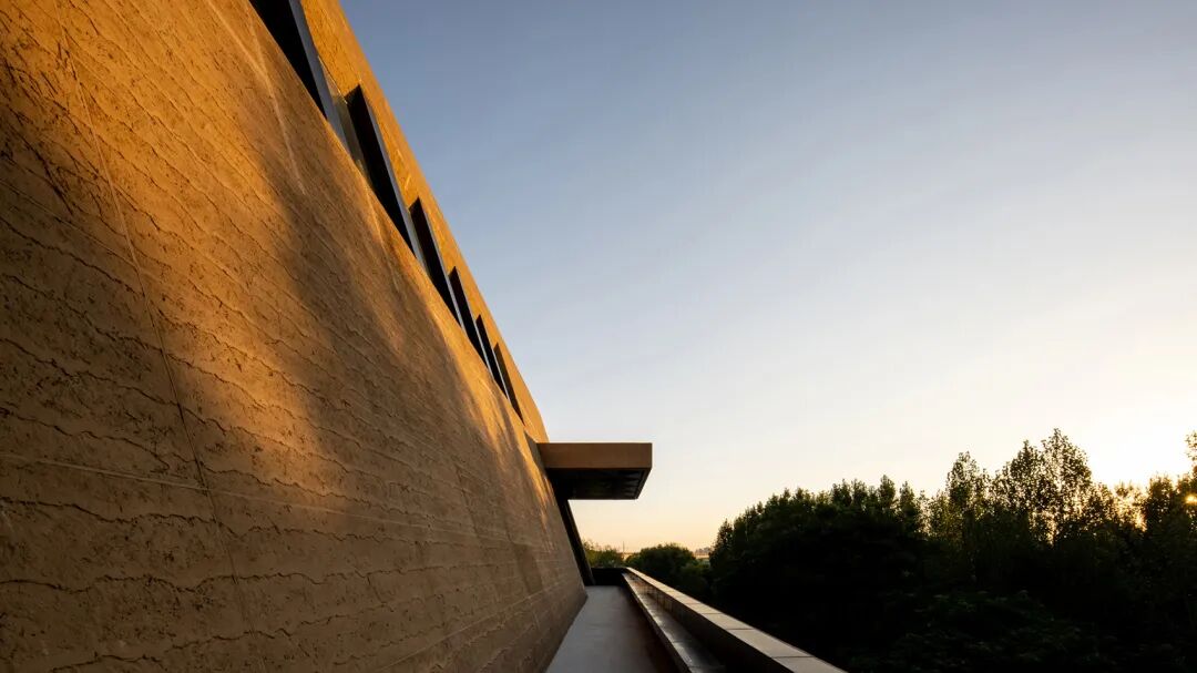 人在台上,眺望渭河和生态林地,阳光和绿植的柔晕在室内随风摆曳。去中心,非传统的构型,金属的感知撞击和张力延伸,光的主动参与,景观的渗透,空间欲望的体验,生成当代的空间语言;超越时间的视感夯土从大地生出、伫立,传达鲜明的时空感;原始的场所功能在自然的尺度中呈现,正如建筑师郑东贤所言:当代性才是表达建筑原始性的方式。