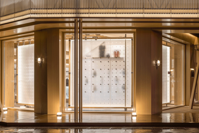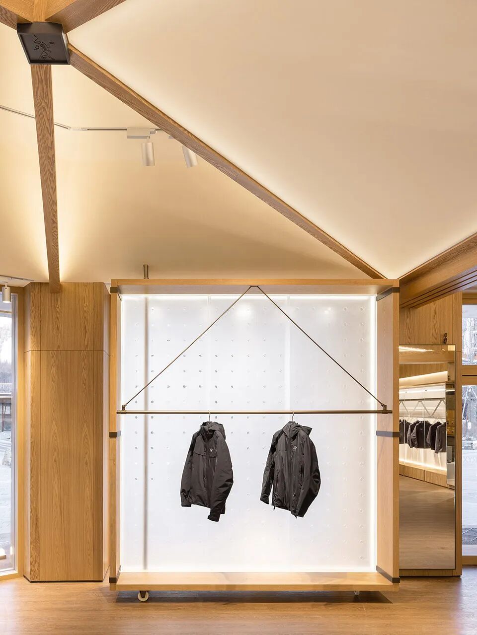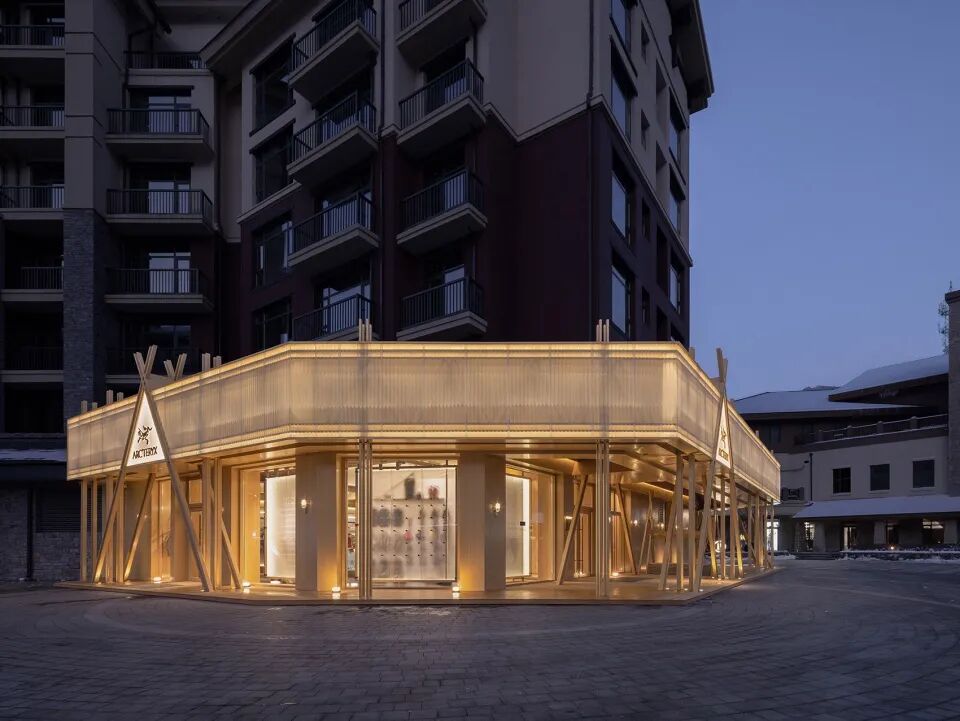 雪地中一团篝火,为空间叙事奠定基调。自然木质的大面积采用,令建筑回归原始风貌观感,与周遭硬质冷色调疏离开来。尽管独居建筑底层一隅,设计以外扩手法呈现加阔的外立面,空间仿佛独立于建筑之外。三角坚实的形体结构在半透明波浪板中若隐若现,又成为主视觉穿插各处,强化篝火的象征意义。有别于传统零售空间多用冷质灯光,从空间之内、连廊、又延展至地面,线性勾勒下,克制而亲近的暖黄晕染笼罩于此,皑皑天地间澄澈,空灵。