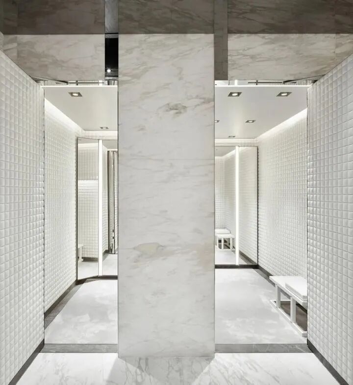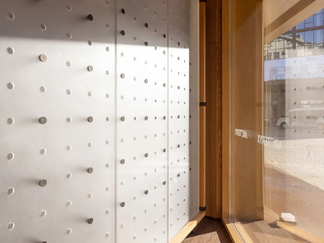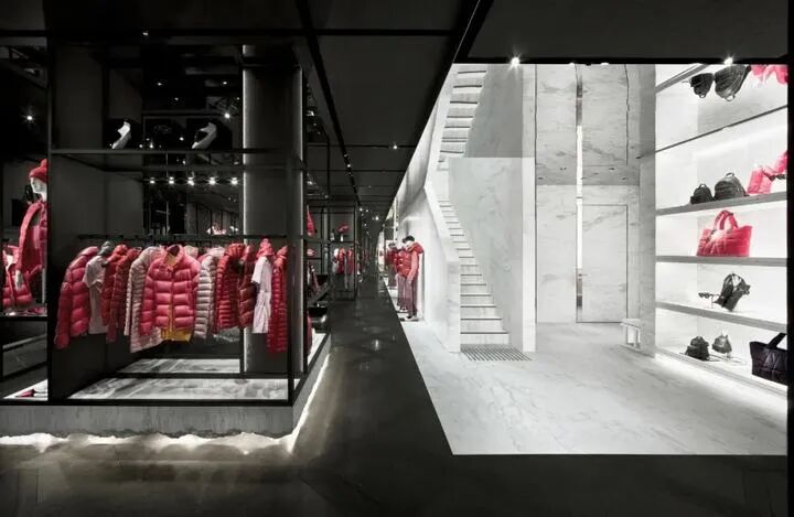 门面是Moncler标志性外形的纯粹表现,132块石头看起来像是从里面膨胀的,像是一块软石头,巨大的门面贯穿三层楼,呈标志性设计的连续图案。对比鲜明的空间表达了蒙克莱尔不同的世界。冰白色的房间,反射镜天花板提醒游客走进冰山。产品展示在纯白的材料上,在纯白的画布上,犹如一把彩色的画笔,在完美的环境中,突出了蒙克莱尔色彩丰富、富有表现力的设计。