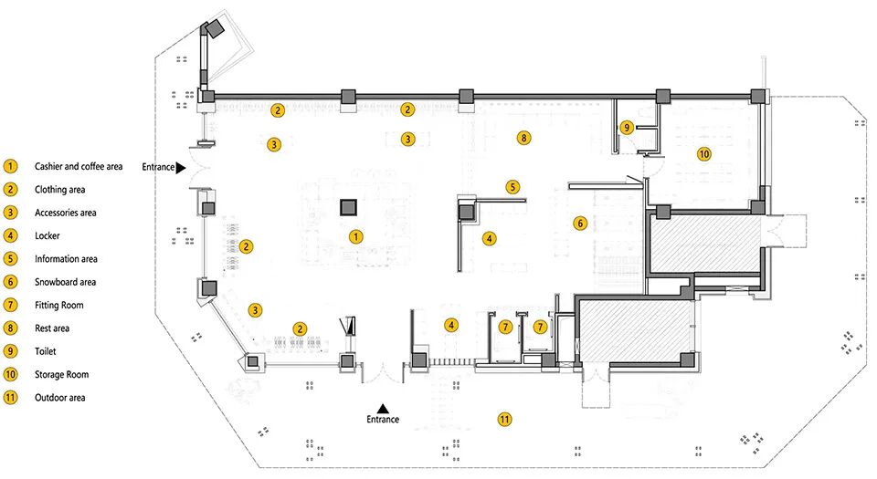 租赁及储存区域则以功能性思考为设计核心,代入滑雪者的使用需求及习惯,沿用非售卖区的整体山地视觉,以多元细节呈现为使用者延续流畅入店体验。箱体储存柜依然配备万向轮,方便随时移动传送,及增加更多存储空间;特设的洗衣机和烘干机,搭配试衣间与更衣间,为使用者带来家般便捷,是在日常需求之外,更为细致的考虑。