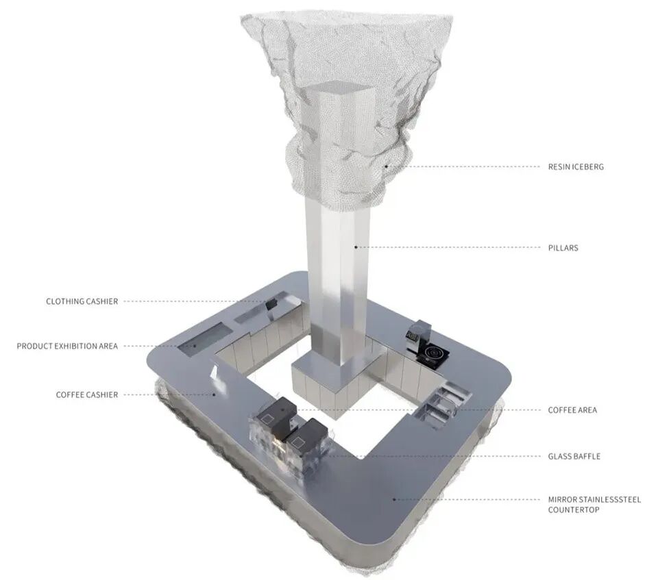 围合造型成为咖啡吧台轮廓,社交重心聚拢于此。毫不规则的有机线条,从吧台中央迸发而出直至顶部的冰山,都在暗示着制作技艺之复杂。通体亚克力的材质,需先以泡沫雕刻模型,不断修正,并且反复测试光照效果,以接近自然真实;最后整体灌注,尽可能减少气泡缝隙,再从南方的工厂一路向北,至北方雪域,与自然冰体虚实相生。