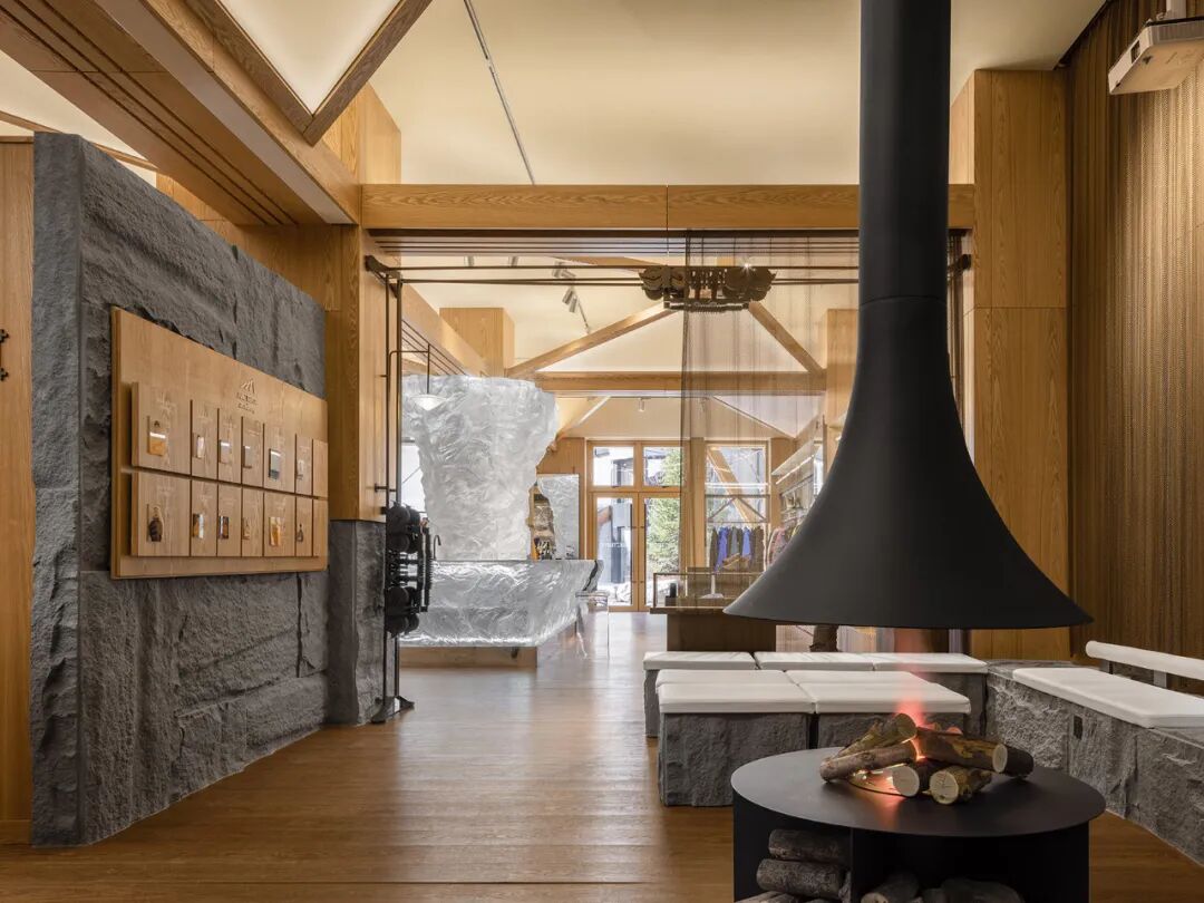 亦是功能性的承载。雪地湿润,为迎来送往的人们提供干湿分离的过渡空间;入口处一旁的悬空木架,可用作雪板晾晒。或即便在门口稍作等待,也不至于被寒风迎面吹得焦灼。