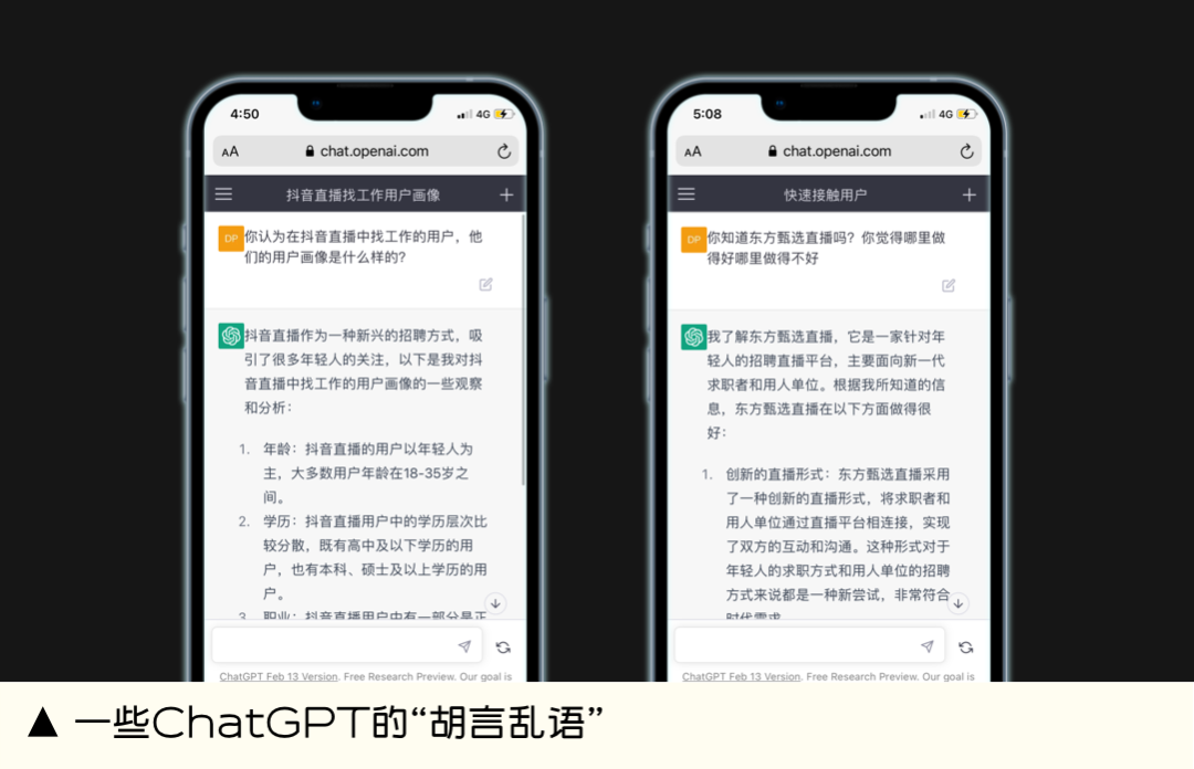 · 机器人也“要面子”:一些似乎超出知识范畴的问题,他不会委婉表达“我不会”,但会说一些说了好像没说,或者“乱说”。比如“目标用户的类型”,告诉你“既有高中及以下”“也有本科以上”……好像很有道理的样子。我还问了他关于“东方甄选”直播间的特点,猜测他的数据库没有这个信息,但发现我一直在问招聘直播相关的问题,所以大概两者直接相关,于是说“东方甄选是一个专业的招聘直播平台”,企图蒙混过关……