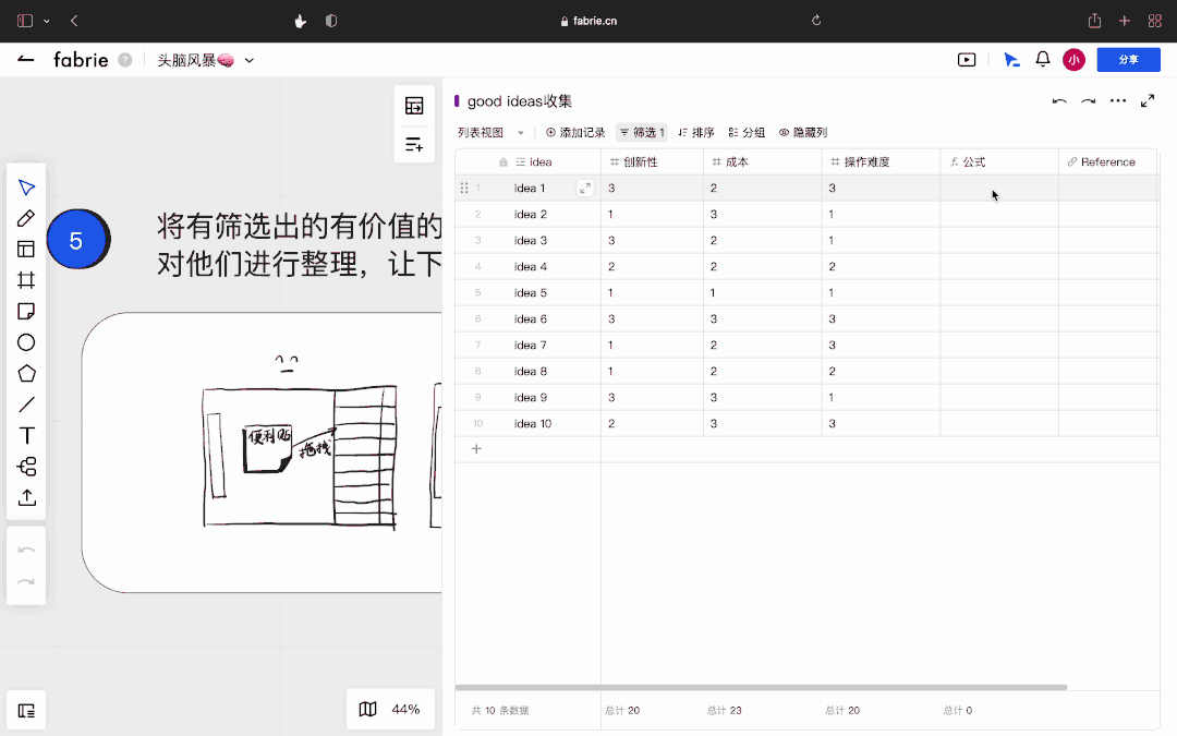 Fabrie的图表关联就可以在此发挥巨大的用处。首先将筛选范围内的idea便利贴直接拖入表格内,然后为你的表格设置几个打分列,比如你可以分三个维度:创新性,成本,操作难度,分数范围可以设置成1-3分。然后第四列中设置一个公式列,将前三列乘在一起,最后进行排序,就可以筛选出值得推动到下一个环节的几个优选方案。