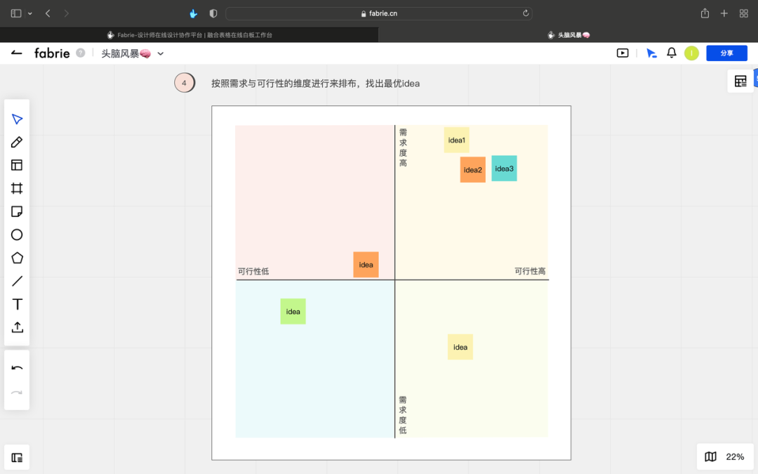 在Fabrie中,每个人可以选择不同颜色的便利贴,在各自的区域里记录下自己的任何想法。可以尝试制定一个小目标,比如每个人在限定时间内产出多少idea。