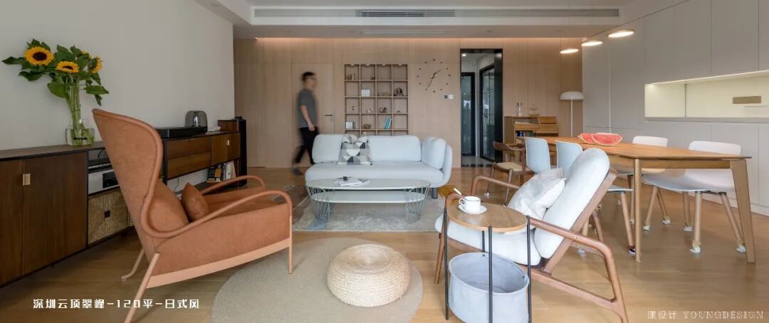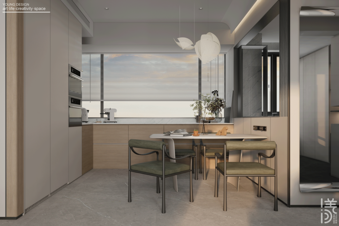 半开式厨房的设计增强了空间通透性,餐厅和厨房的融合,用折叠窗户进行隔断,闭合时是生活肆意的油烟,打开时是家庭欢乐互动的一隅。