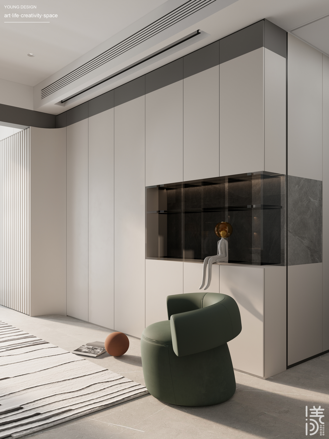 床的另一侧特意设置了女主人的梳妆台,将从门口延续过来的屏风截断,利用靠近飘窗的位置,增加氛围灯光,既不会显得突兀,又将梳妆台的颜值抛向一个高度。整面的衣柜设计,就能搞定卧室的全部收纳,浅色的柜门一点也不压抑,平时还能当作投影幕布,看看电影,追追剧,真的过瘾。