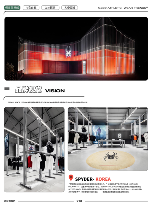这本最新的男装运动趋势书籍从『假日俱乐部』、『内在自我』、『山林探索』、『亢奋领域』四大主题,每一主题围绕着各年龄段,不同人群,不同生活方式与穿着理念出发详细预测解析相关的设计要素,关键细节与重点款式品牌推荐。内容汇集了众多专业运动,户外运动与时尚运动品牌和最新运动潮流亮点。