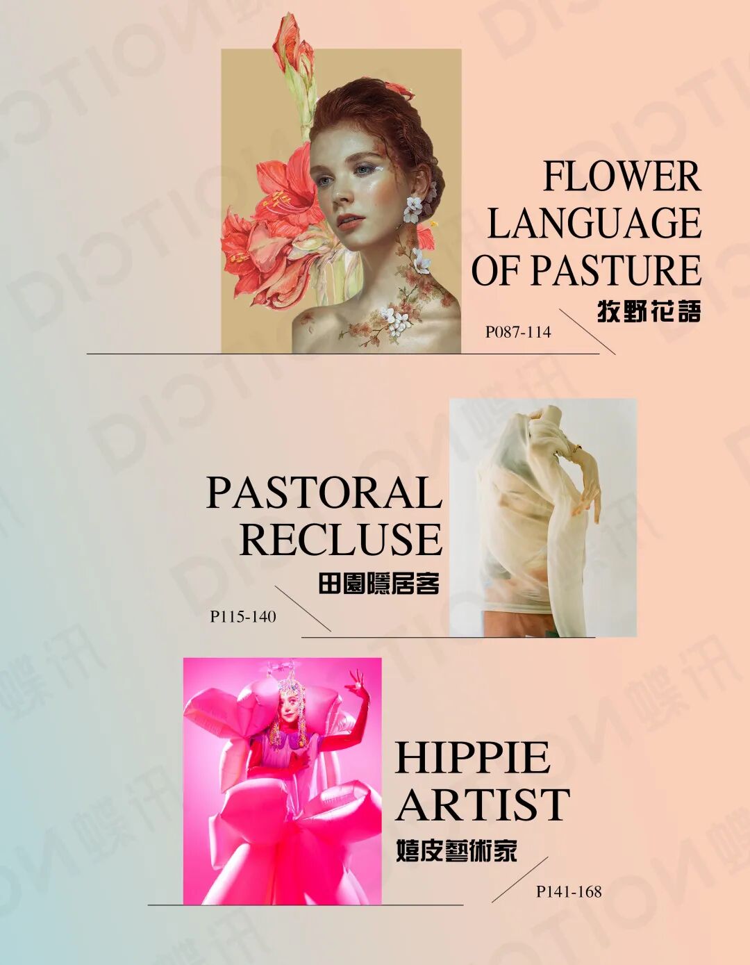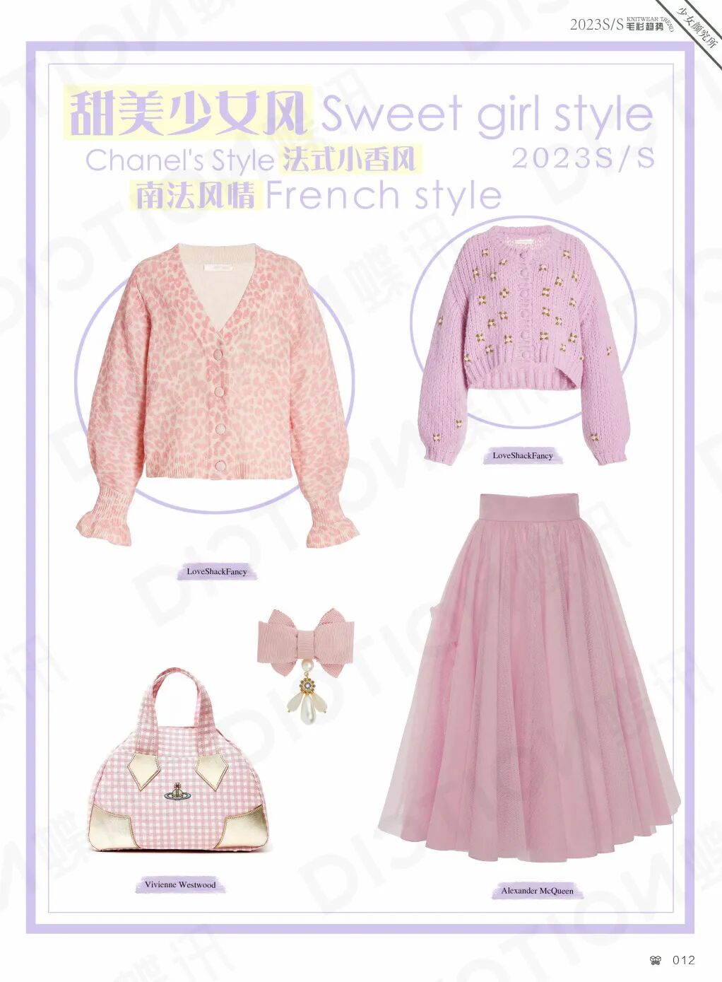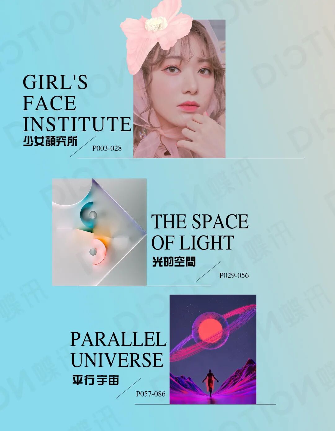 主打甜美少女风格,重点解析少女市场的热门趋势和明星单品推荐。清新色调作为切入点,利用幻影绿、紫丁香、沙粉色、柠檬气泡水作为基础色彩,在温馨暖色调氛围之下,催生出梦幻的浪漫情绪,以甜美少女为载体,传递出更为活跃与鲜活的青春气息。