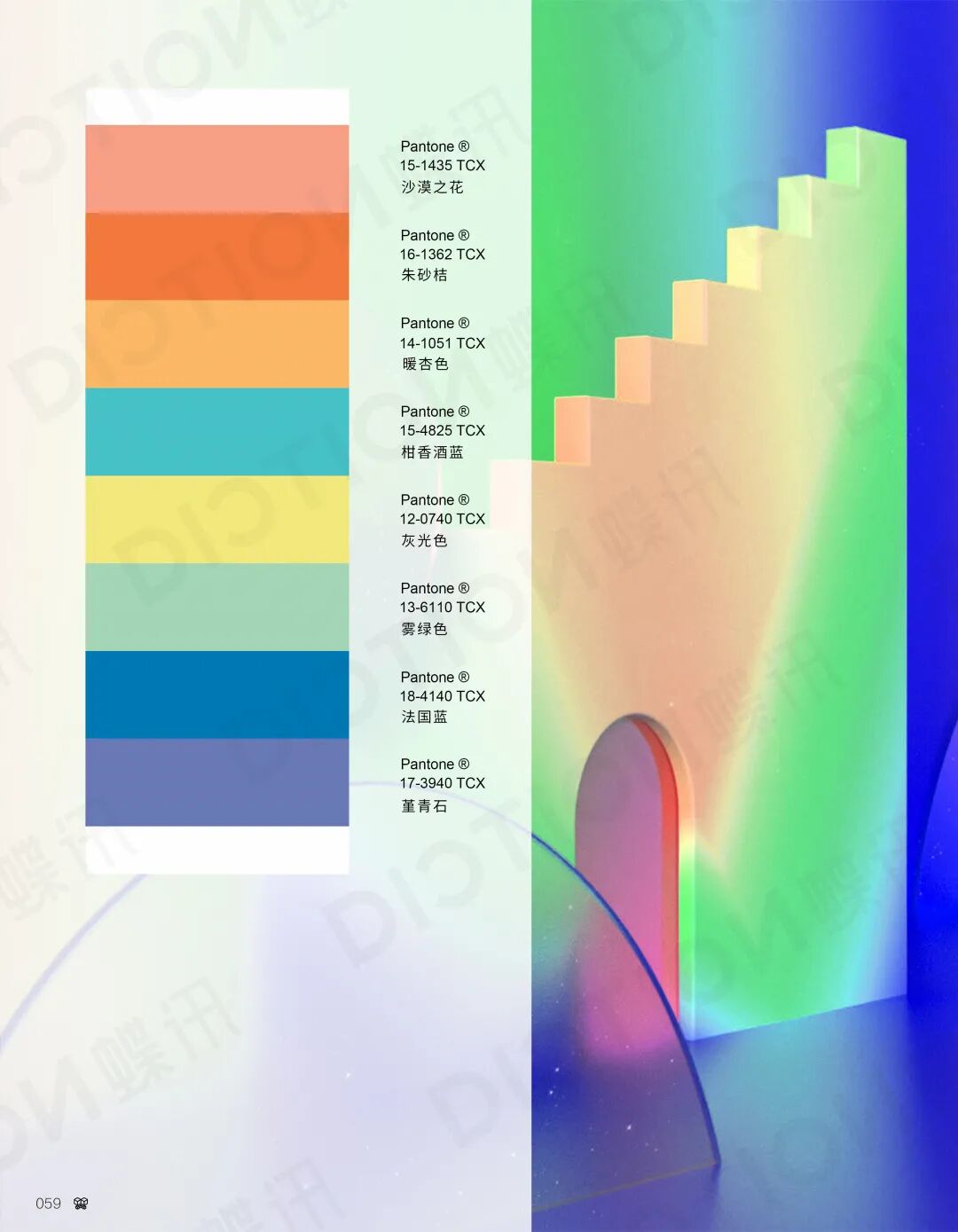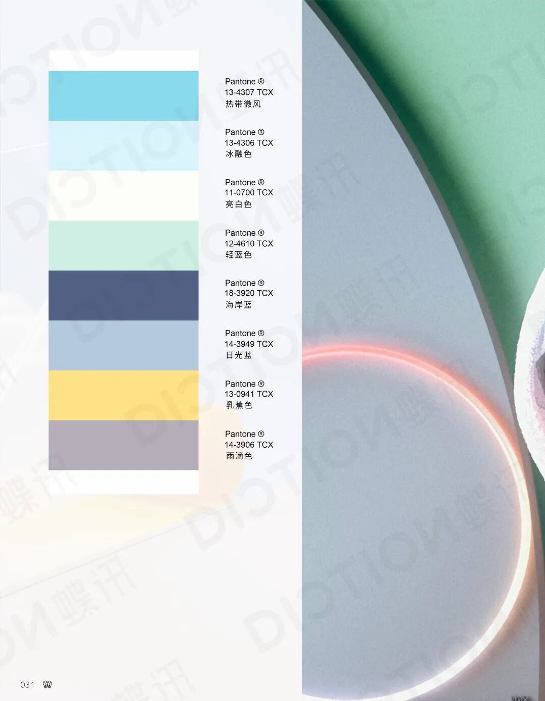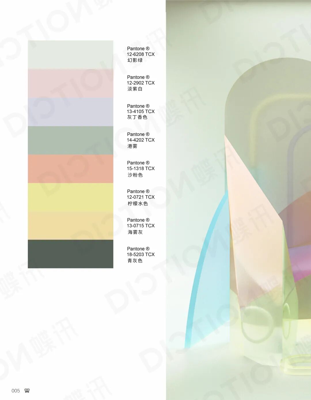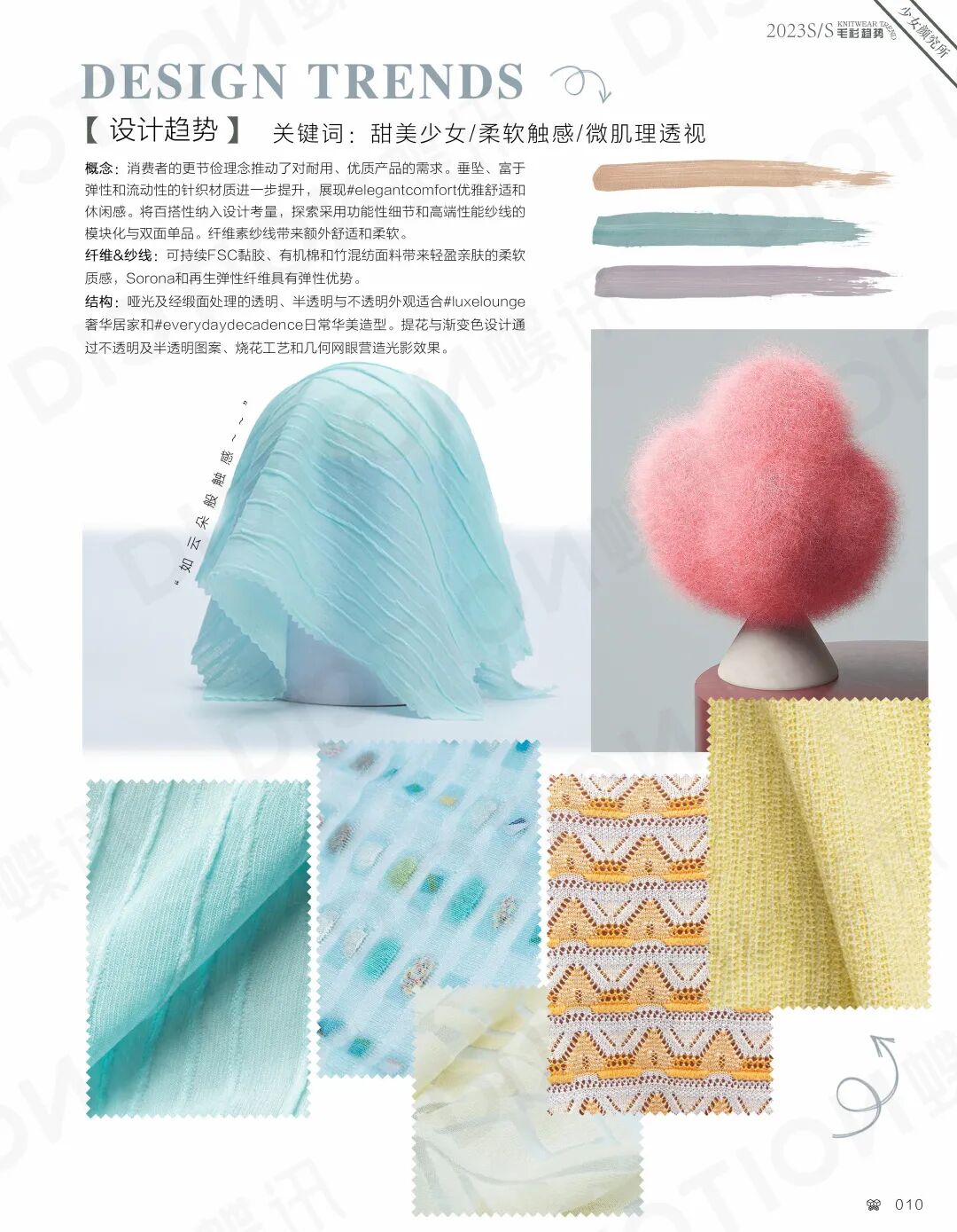 主打甜美少女风格,重点解析少女市场的热门趋势和明星单品推荐。清新色调作为切入点,利用幻影绿、紫丁香、沙粉色、柠檬气泡水作为基础色彩,在温馨暖色调氛围之下,催生出梦幻的浪漫情绪,以甜美少女为载体,传递出更为活跃与鲜活的青春气息。