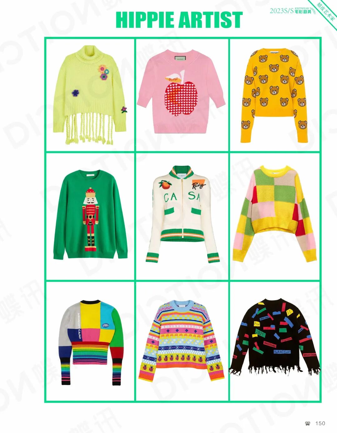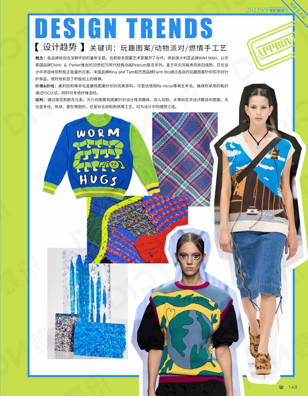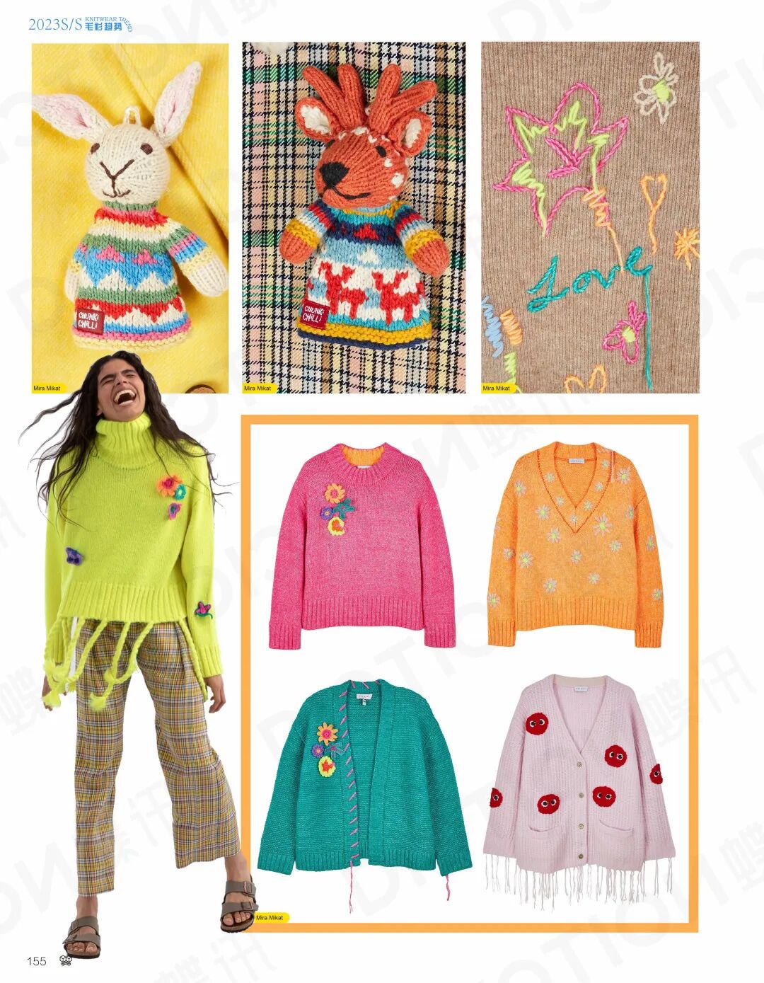 各品牌依旧在深耕怀旧的童年主题,也和很多图案艺术家展开了合作,鉴于欢乐风格表现依旧强势,可在设计中添加体现积极正能量的元素。通过玩趣图案针织和平纹针织单品,很好地彰显了积极向上的精神。通过提花和嵌花元素,为几何图案和图案针织设计增添趣味,加入动物,水果和花卉设计醒目的图案。