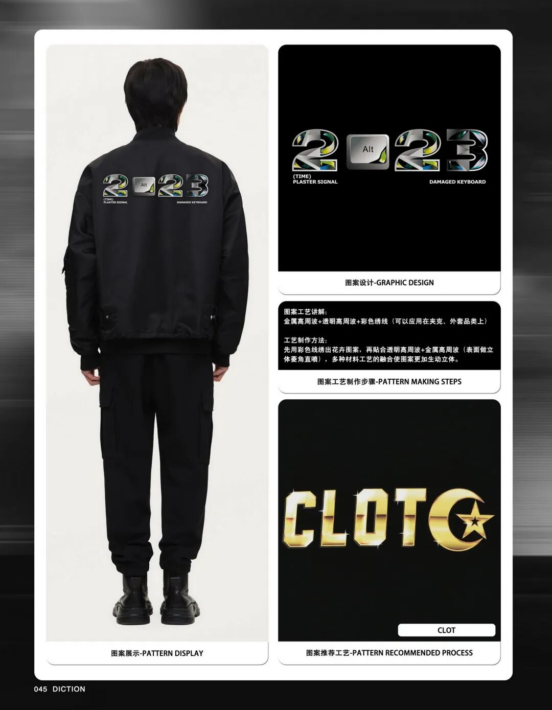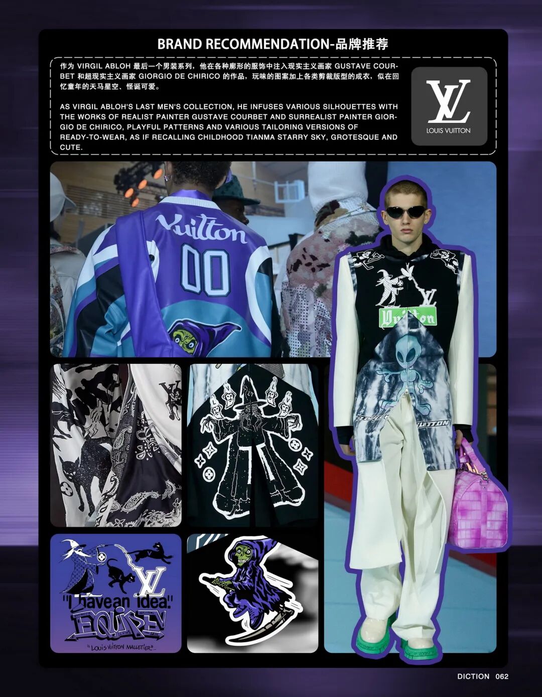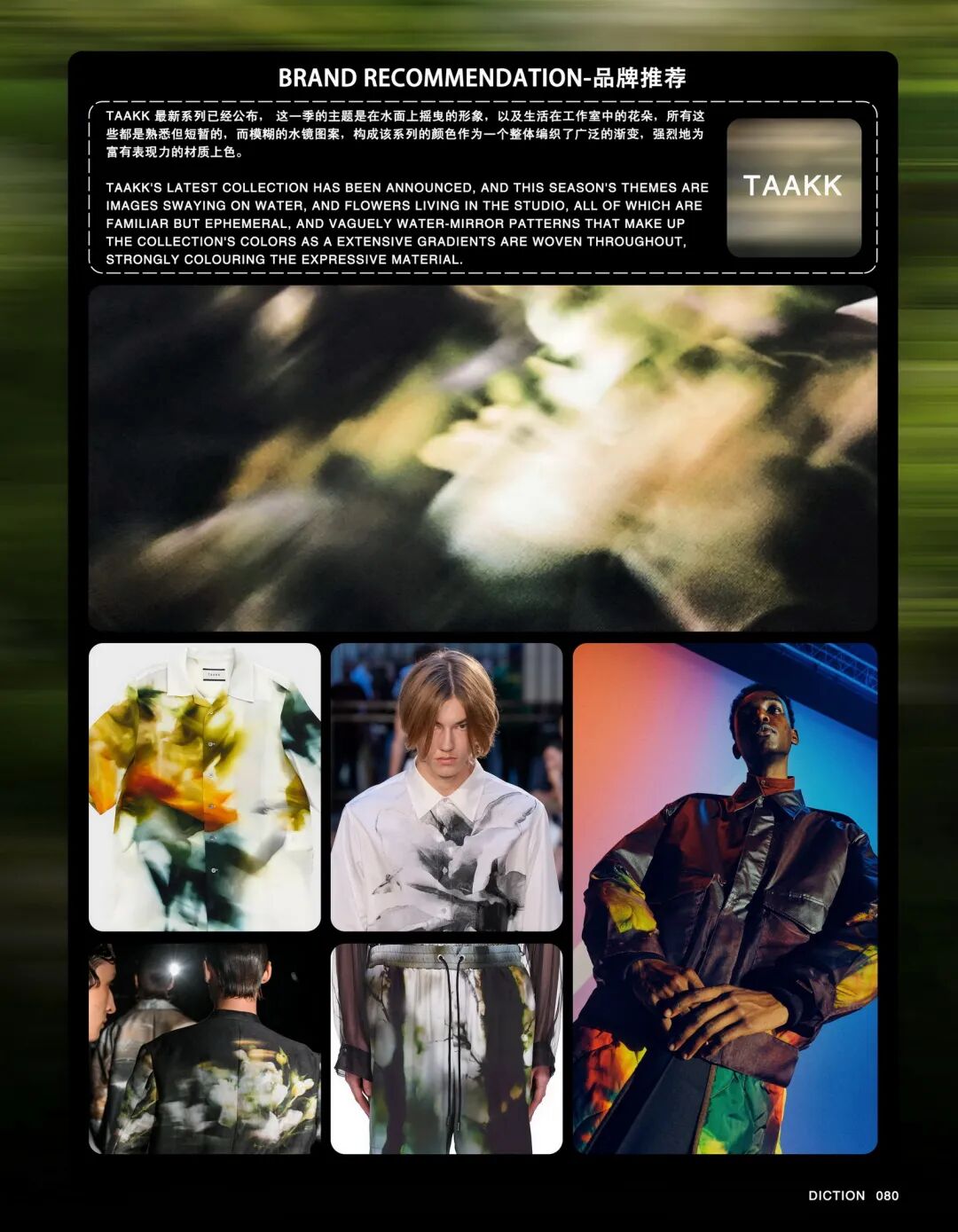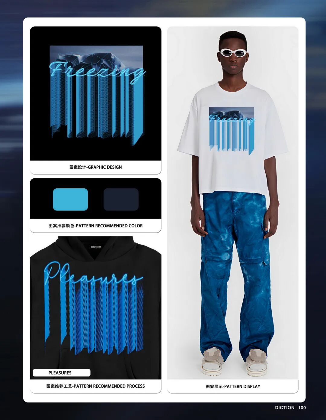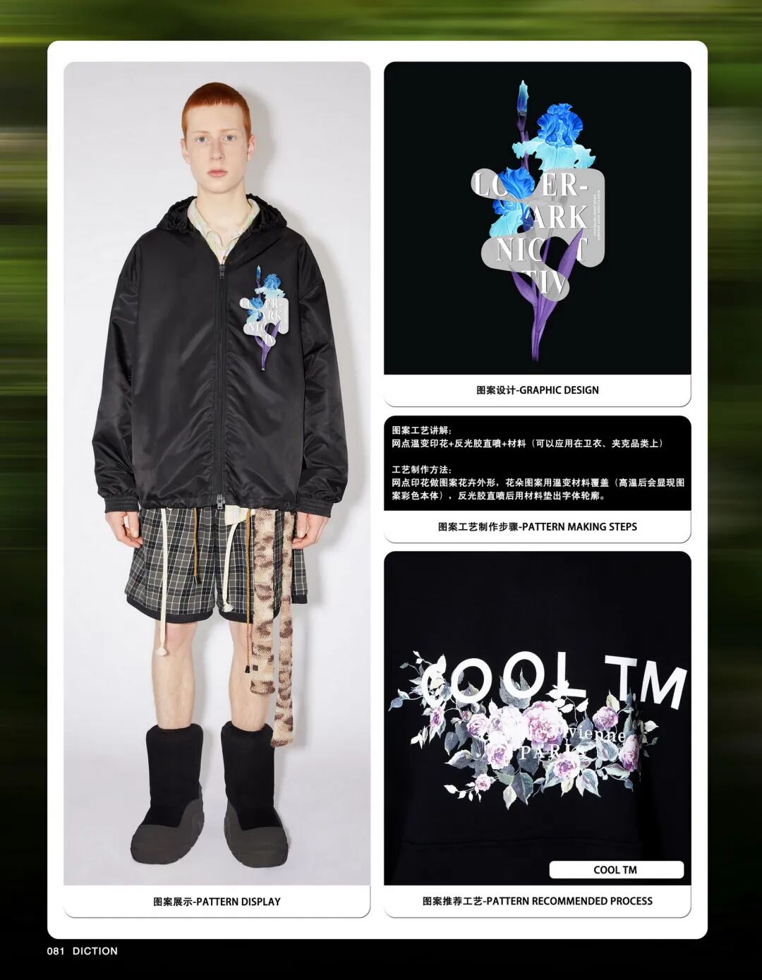 本书籍紧跟流行文化元素,提取了6个主要的创作方向,包括「开放世界、集结指令、数字空间、暗夜狂欢、自然联系、弥散冰川」等主题,详细解读男装2023/24秋冬图案趋势。