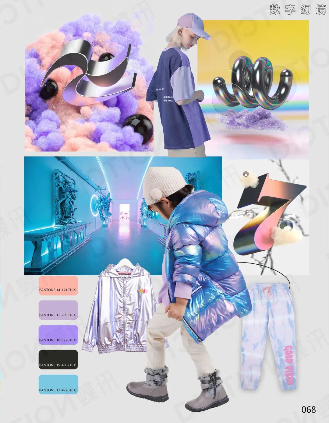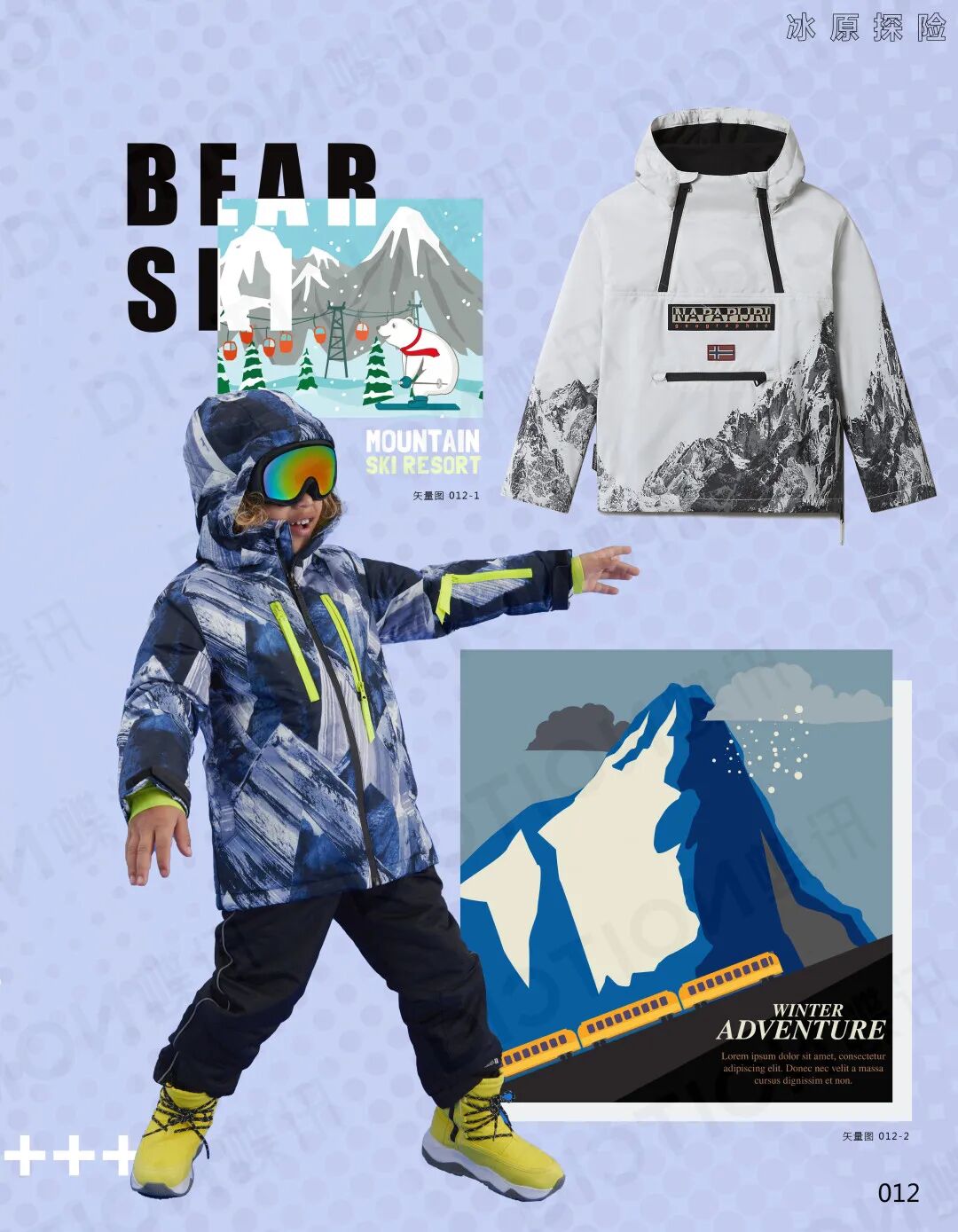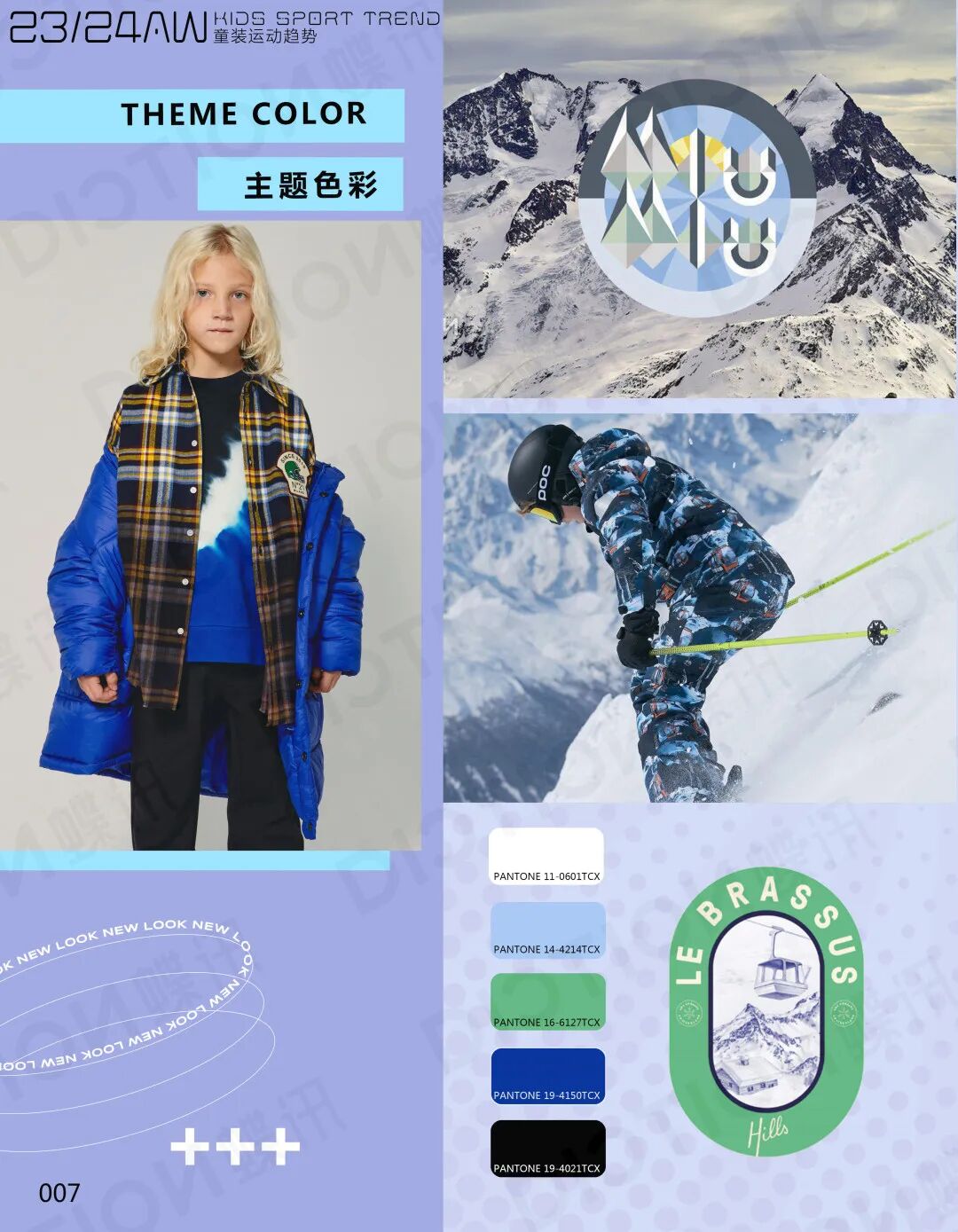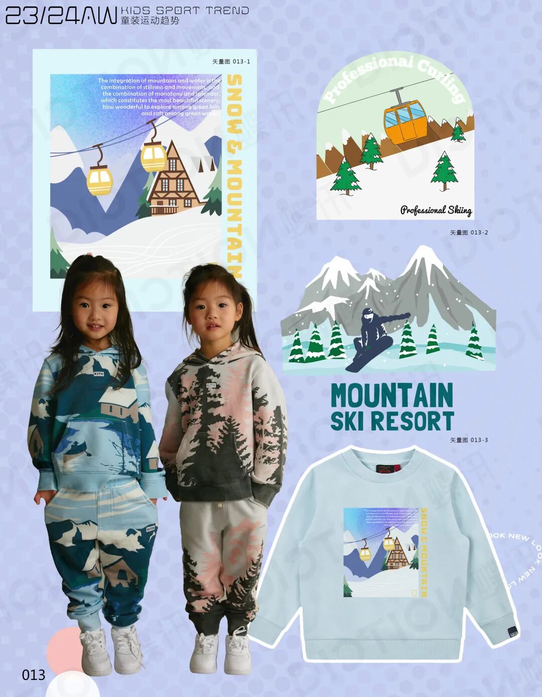 随着户外时光趋势的发展,可尝试模拟崎岖地形的雪地探险主题图案。这一主题持续影响童装印花和图案,品牌开始通过滑雪图案和文字应用彰显新意,随着北京冬奥会的成功举办,滑雪装备日渐融入大众生活。户外风格对都市运动的影响持续不减,滑雪服细节工艺融入常规棉羽绒款式打造功能性与耐久单品成为一大趋势。