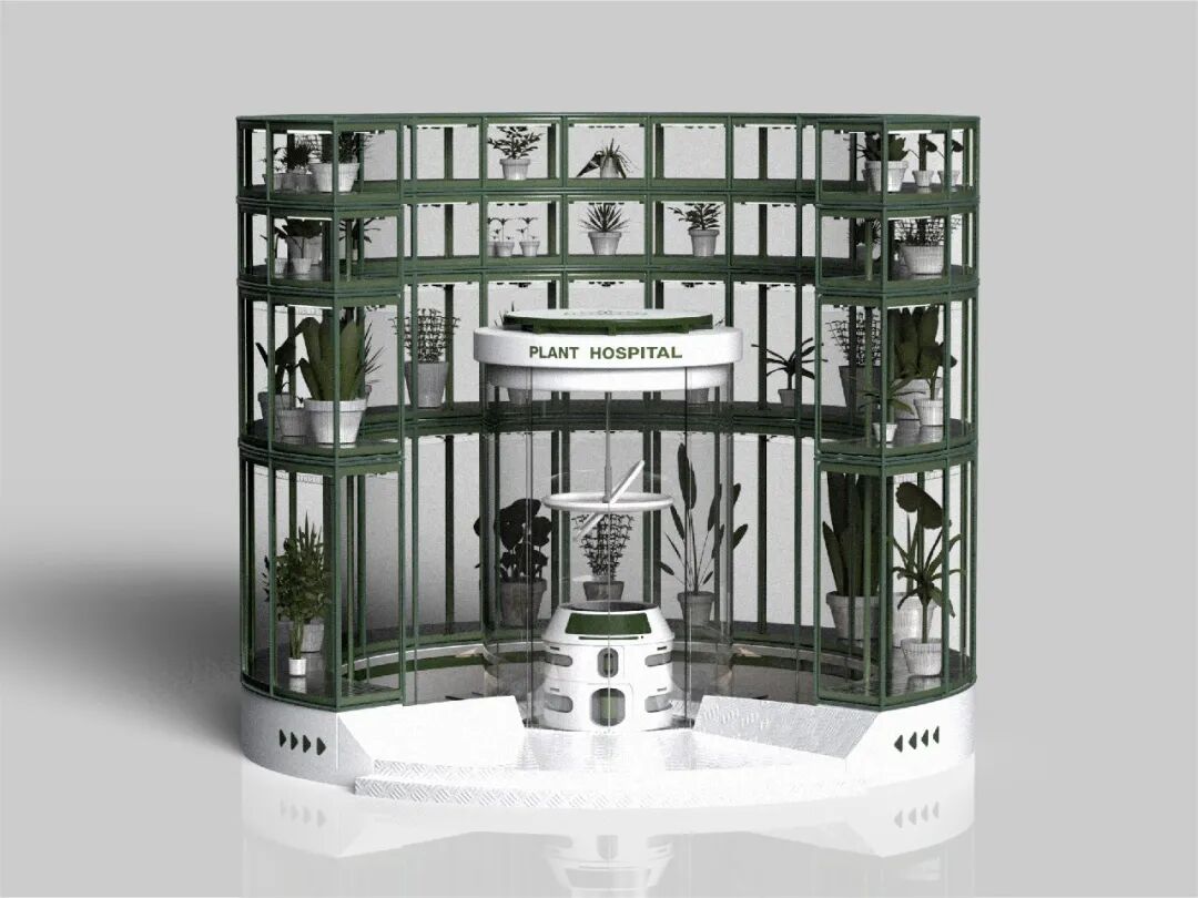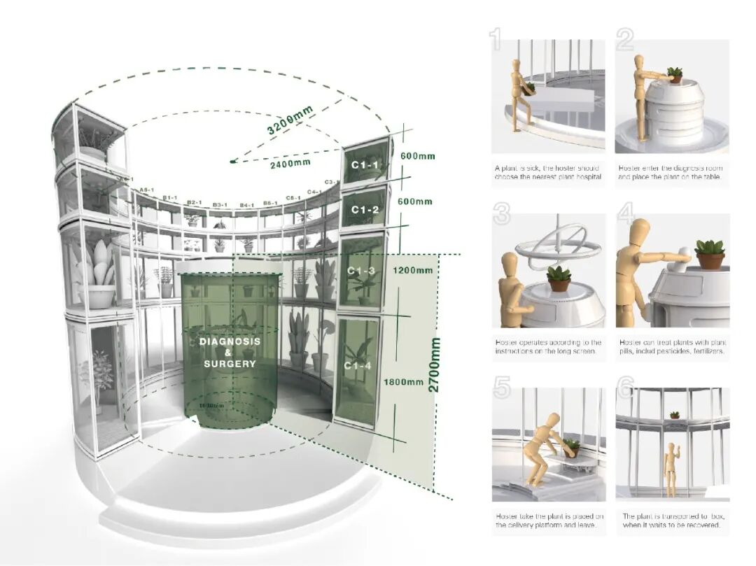 许多人经常因为不了解植物的习性,导致了植物的枯死。Plant Hospital 属于公共互动功能产品,协助都市居民拯救并治疗生病或濒死的家庭盆栽,其功能划分成五大区域:诊断协助区、住院区、代管区、土壤恢复与发酵区、分享区。使用者将可通过手机,依照需求选择植物医院服务项目,并将植物带到植物医院处置,病情严重植物甚至还能留在植物医院治疗。