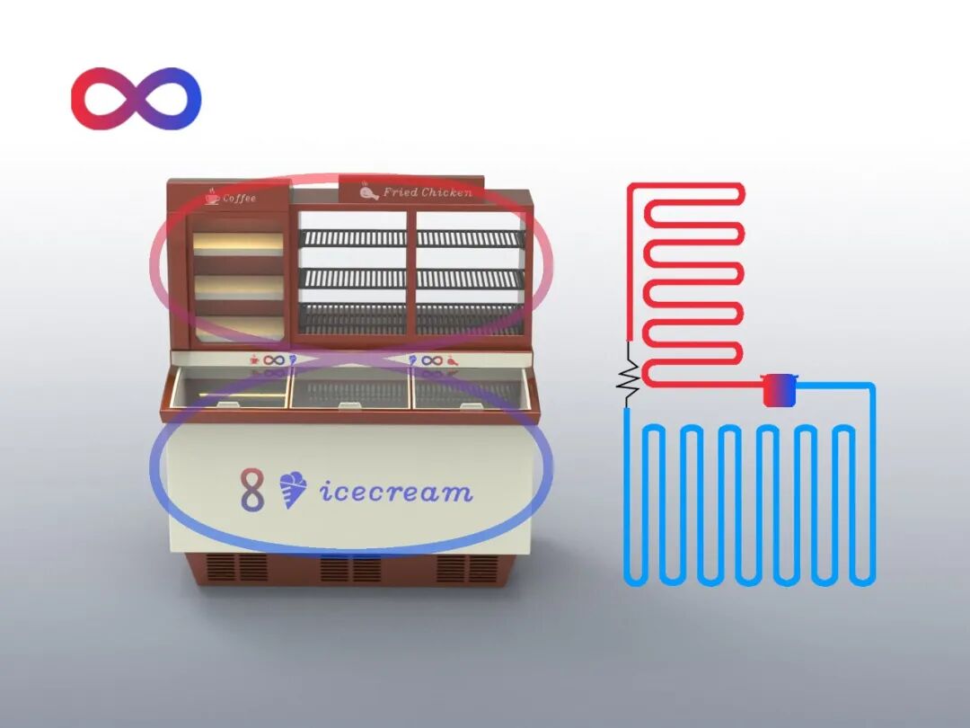 气候变暖造成的极端气候现象日益严重,最近这几年的冬天几乎一年比一年还要冷。我们可以试着运用系统化的科学方法,避免今后的资源浪费。根据我们的发明概念,冰箱和保温柜将再也不是毫无关系、彼此独立的两样物品,而是由保温柜连带利用冰箱散发的热度,维持柜内温度。压缩机则让媒材在系统内循环,达到大幅节省能源的目的。城市里若能有更多的商店选用这套循环系统,那么每一年我们都能省下许多宝贵电力。