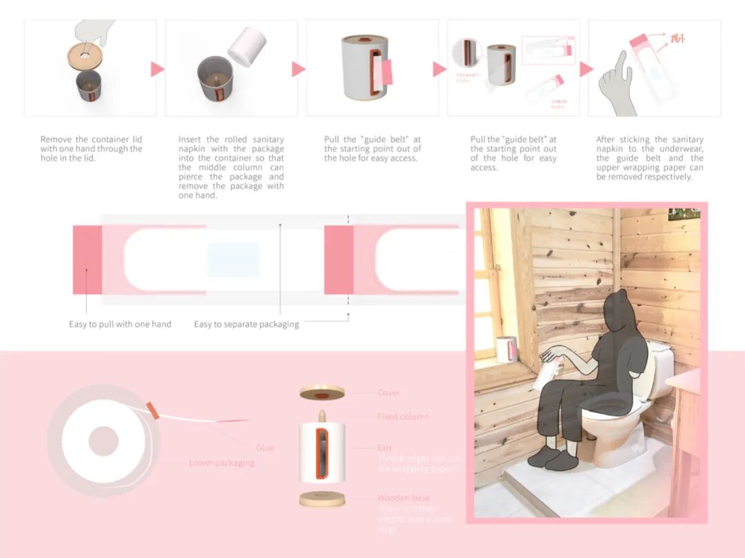 肢体障碍对于人的生活方式影响很大,往往涉及生活的各个层面。例如:身体障碍人士 (尤其是只有一只手臂的女性)如何才能自如地使用经期卫生用品,值得我们深思。但显然易见的,市面上现有的卫生棉对于只有单边手臂可用的妇女而言,不仅包装拆卸不易,也很难凭一己之力取用换穿。这款卫生棉以“卷筒卫生纸”为设计概念,装在“抽取式”卫生棉盒里面,方便单臂女性独力完成拆开包装、去除多余包装层和黏贴的程序。
