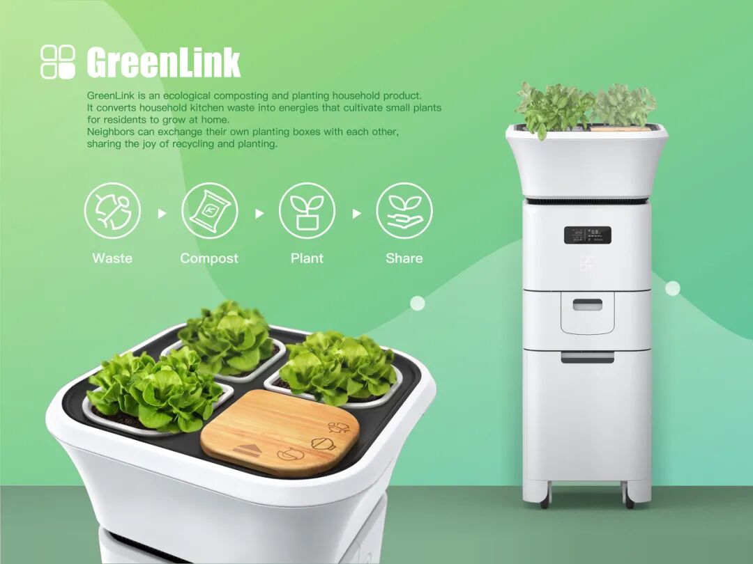 GreenLink 是友善生态的家用堆肥与耕种机,可帮助都市的社区邻居重拾人际交流。它能把家庭厨余变成栽种小型植物的资源,鼓励民众在家就能养花种草。邻居们还可以通过应用程序互相交换栽种盒与多余肥料,分享回收与栽种的快乐。这项产品旨在帮助更多人迈向符合永续发展并友善生态的绿意生活。