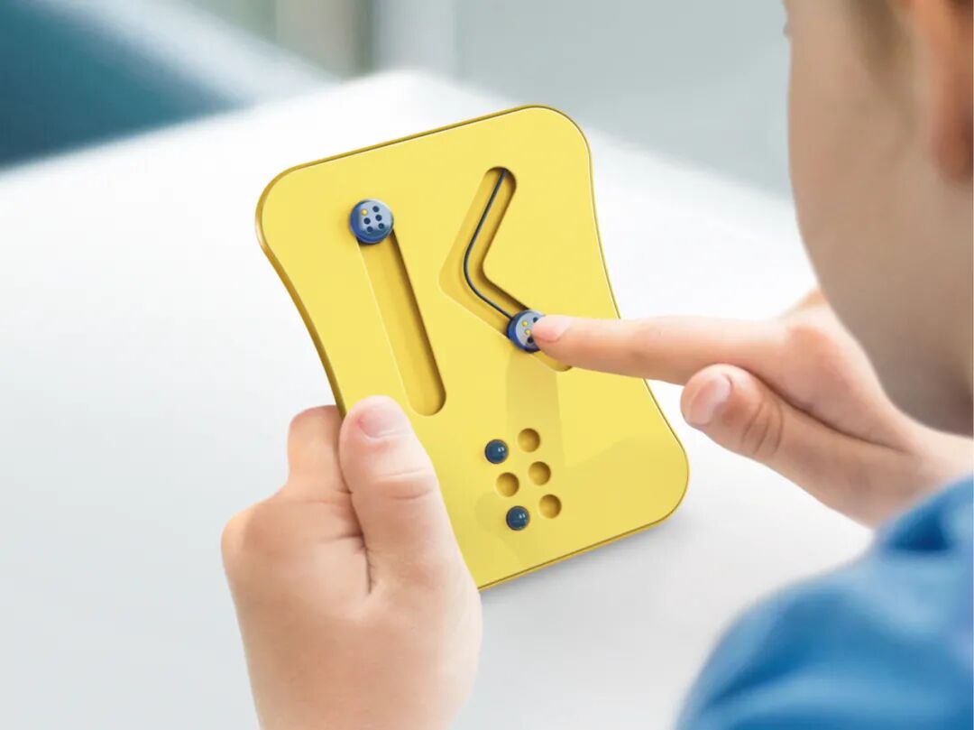 这套卡片专为视障儿童设计,协助孩子们通过触觉学习字母,解决他们的日常生活问题。依数字顺序,将手指放在笔顺按钮上拖曳,就能一步一步跟着卡片,学习字母的形状和书写顺序。接着,孩子可以拿掉按钮,触摸卡片底部的字母点字。