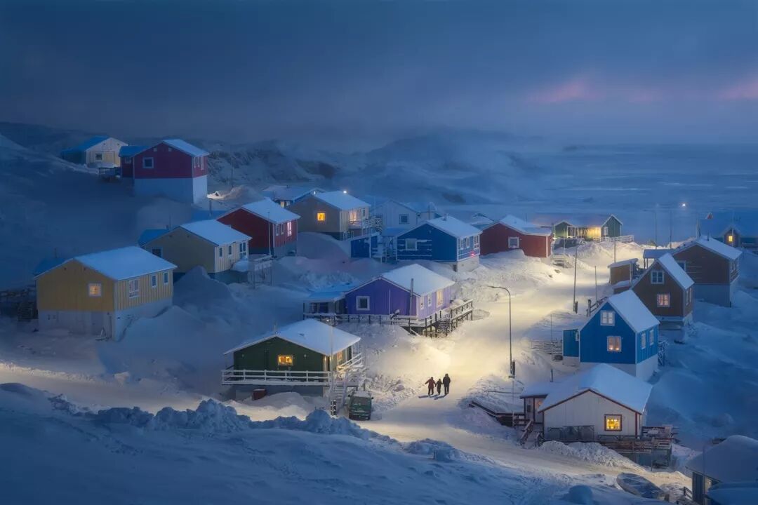 蓝色作为整个环境的背景色,和冰天雪地的地貌十分搭配,烘托了北极气候的寒冷。而灯光和房屋的黄色,则与蓝色对比,突出了小镇的暖意。