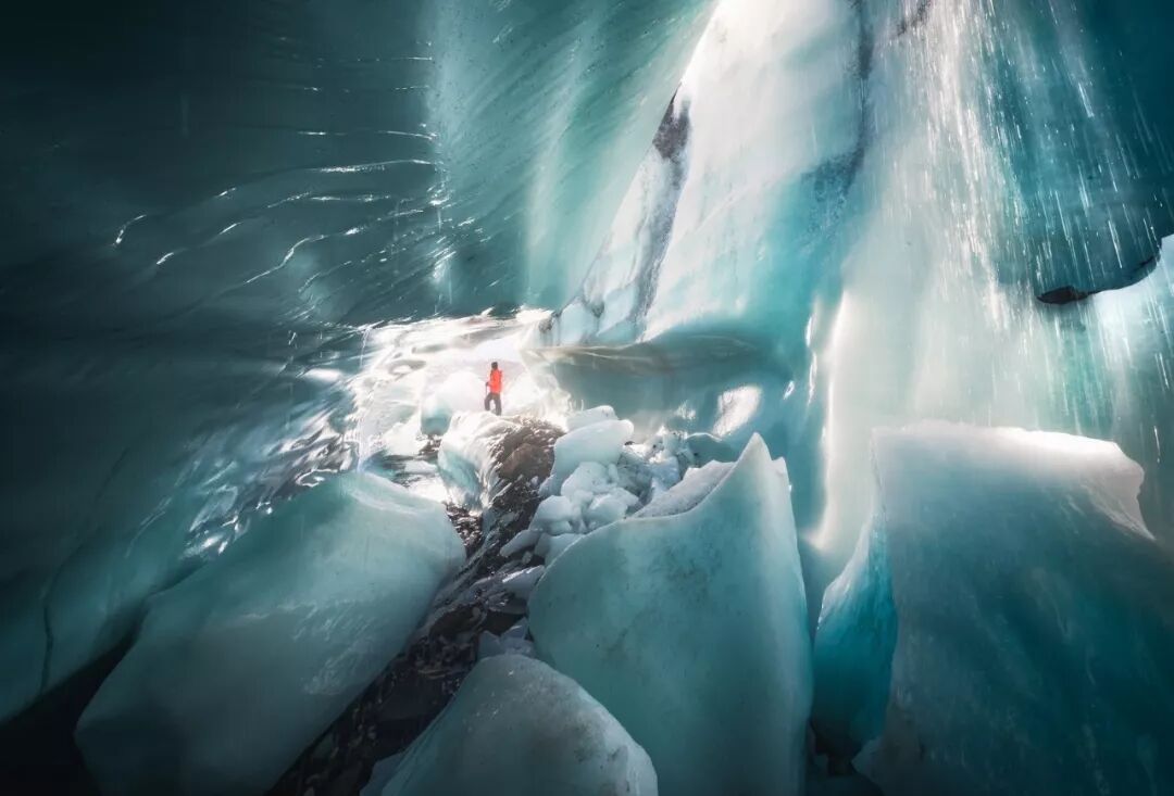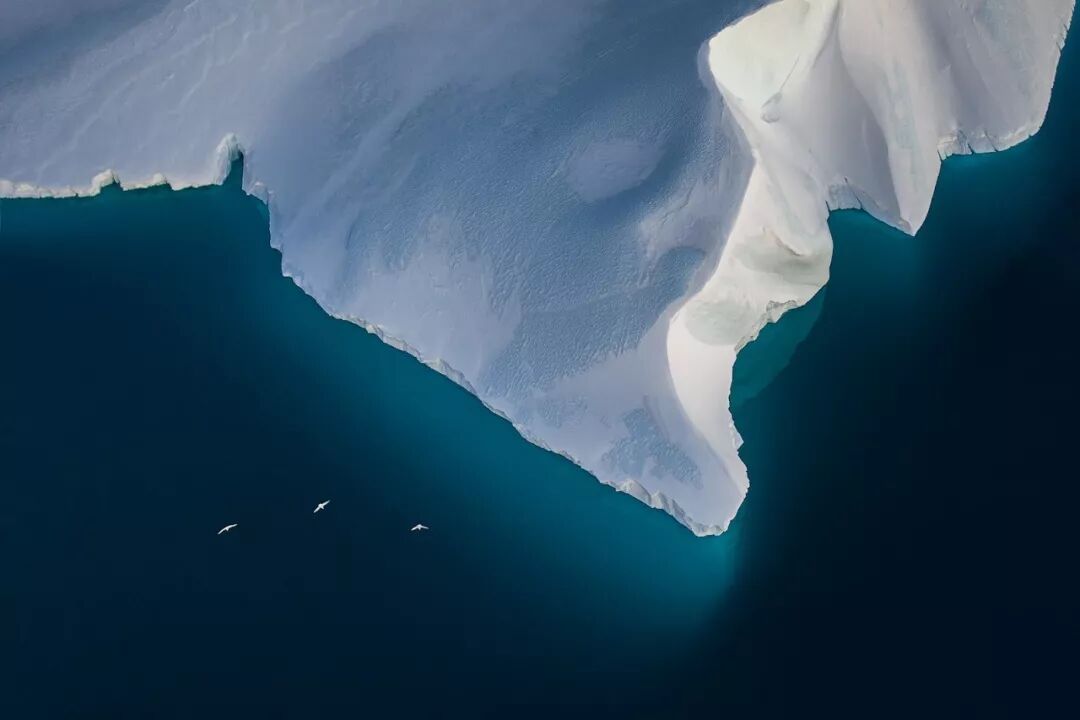 白色的海鸥更加真实,而且和周围的青绿色反差已经足够明显,与冰川的白色相呼应。并不需要多此一举的把海鸥给调成红色、黄色。