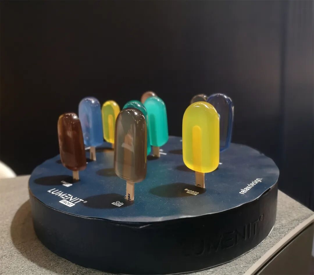 Relex 为展示用于新品的新材料,制作了这个特别的“冰棒”色卡。这个对象旨在增强LUMENIT系列®固体表面的美学特征,有两种不同的饰面和5种展示颜色。