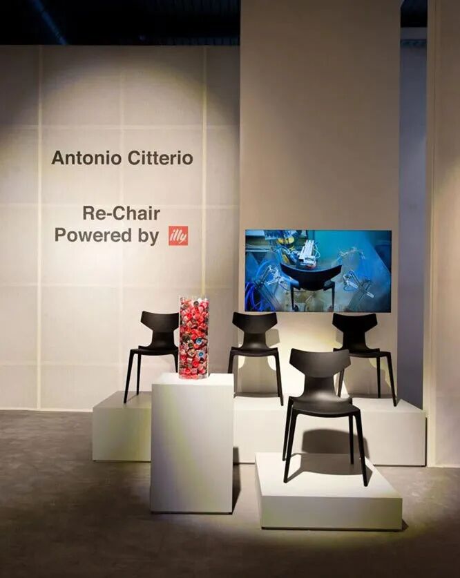 原就是用回收材料打造的Re-chair系列,今年新成员的材料更加特别——Kartell与illy咖啡合作,由回收的咖啡胶囊制成的Re-chair在此诞生。