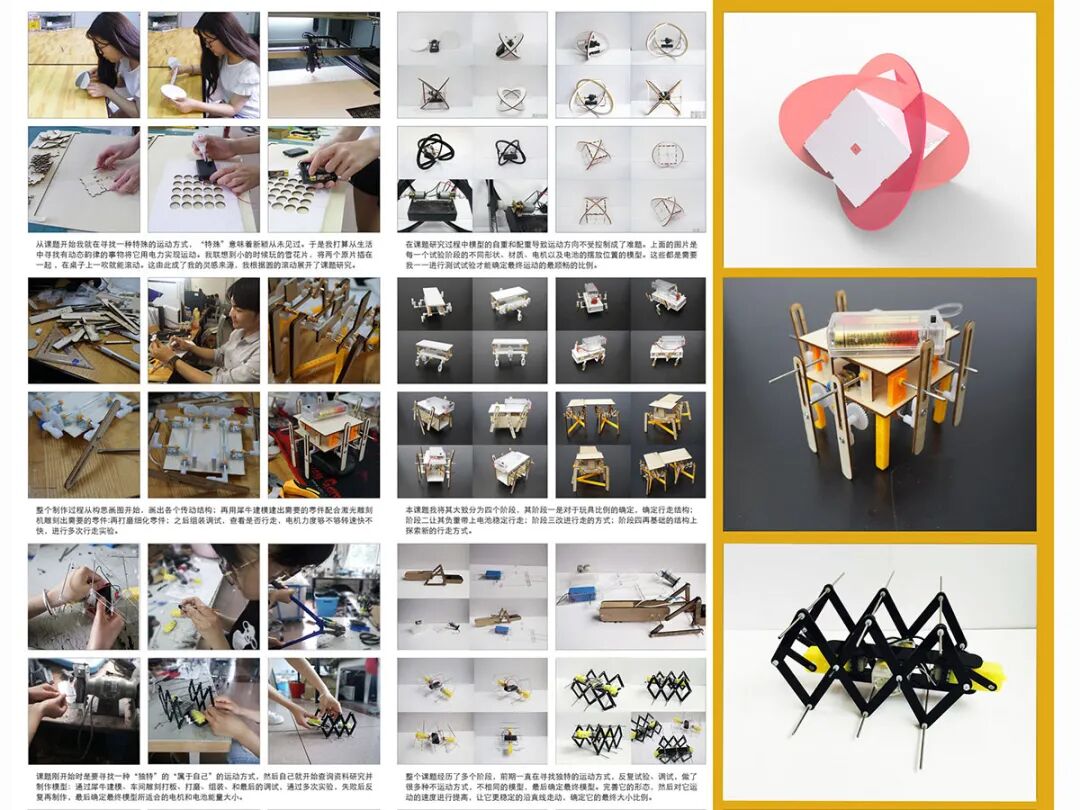 第一个模块是以工程基础为核心的学科基础课程群。围绕工程和设计过程中学生需要掌握的最基本知识和具备的最基本能力,从力学和结构研究、传动和机构研究、智能和控制研究、材料和感受研究等4个维度进行基础性训练。这个过程主要在一年级到二年级进行,涉及到4门学科基础课程,学生要先后完成大小9-10个不同难度的课题,平均制作各种类型模型30-40个,能够对工程和设计领域涉及到的基础性结构问题、技术难点和解决问题的方式有深入的掌握(图7~9)。