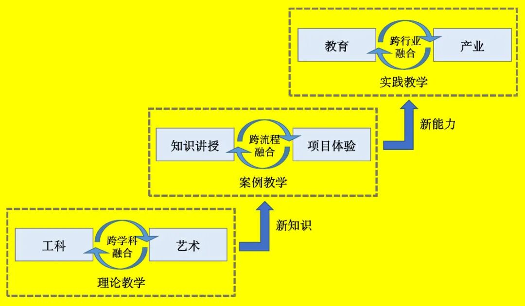 传统教学内容强调学生掌握和运用知识的能力,但对其他能力的培养偏弱。因此,本文认为要开展融合式的新人才培养模式探索,以提升学生的综合能力,即在教学过程中尝试跨界元素的深度融合。如在理论教学阶段,开展艺术学科与工科学科融合式教学,实现跨学科的新知识讲授;在案例教学阶段,开展知识讲授与项目体验融合式教学,实现跨流程的新能力培养;在实践教学阶段,开展产业与教育融合式教学,实现跨行业的新技能训练。