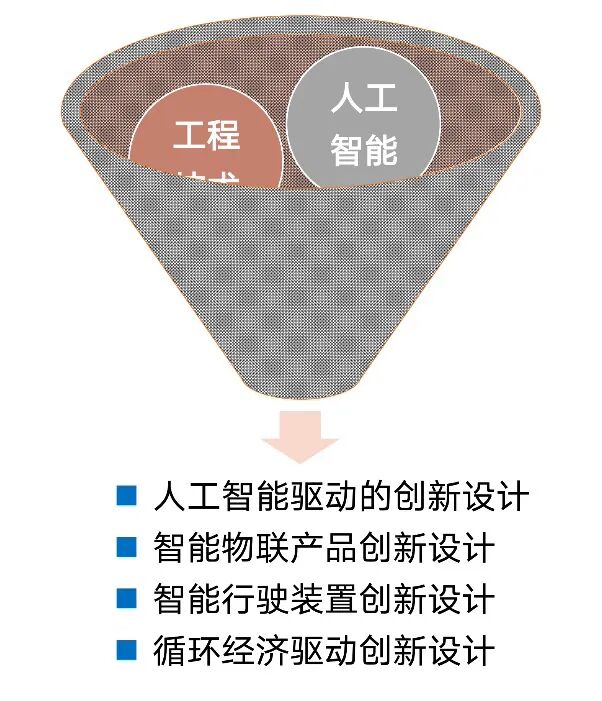 2.艺术与工科融合的应用实践:近年来上海交通大学工业设计专业积极开展艺术与工科融合教学,通过在工科课程中,融合心理学、美学、信息学、人文社会科学等其他学科知识,特别是社科类知识,培养学生的发现问题、创新思维、用户体验、交互设计与创新设计能力,养成以人为本、问题驱动的设计理念,提高审美情趣与创新能力。以胡洁教授主讲的致远荣誉课程《创新思维与现代设计》为例,首次引入了“人工智能驱动的创新设计”、“智能物联产品创新设计”、“智能行驶装置创新设计”、“循环经济驱动创新设计”等最新的创新设计成果,在教学内容层面上,实现了“工程技术”和“人工智能”为代表的科学与“艺术美学”为代表的艺术之间的融合,构建了完整的艺术与工科融合的课程体系,如图2所示。