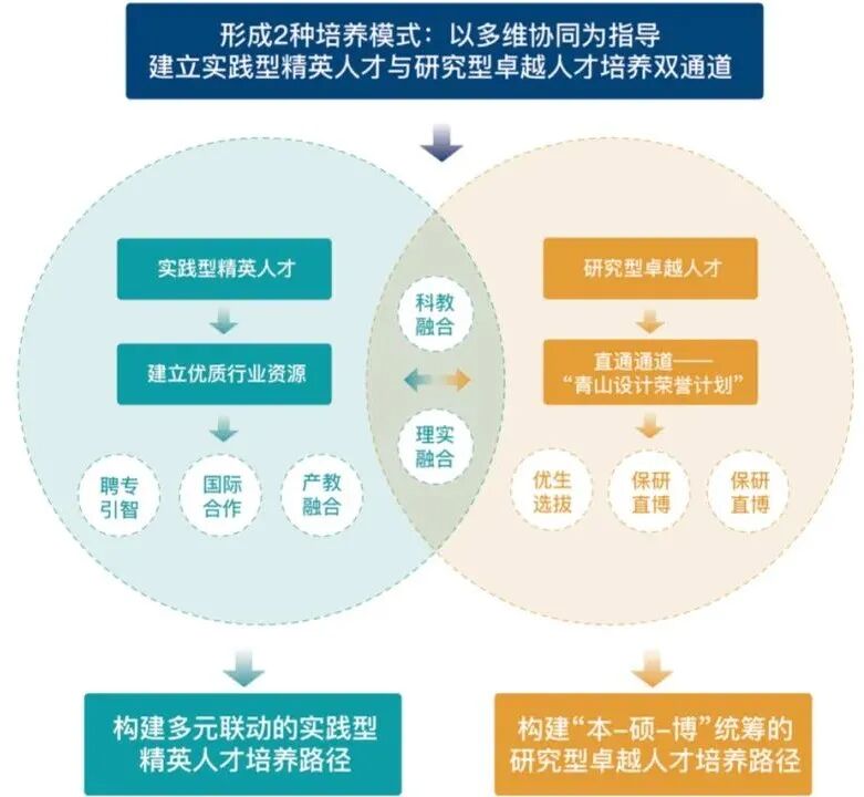 面对未来社会的多元发展,学院拓宽人才培养路径,实现人才培养的多维化。为实践型精英人才建立优质行业资源,通过聘专引智、国际合作,深化设计实践,实现人文创新,构建多元联动的实践型精英人才培养路径。为研究型卓越人才提供直通通道——“青山设计荣誉计划”,通过优生选拔、保研直博、导师对接制度,因材施教、精准育人,构建“本-硕-博”统筹的研究型卓越人才培养路径。通过跨平台课程的科教融合、一流企业的产教融合、导师工作室的理实融合,对实践型人才与研究型人才进行多维协同培养。