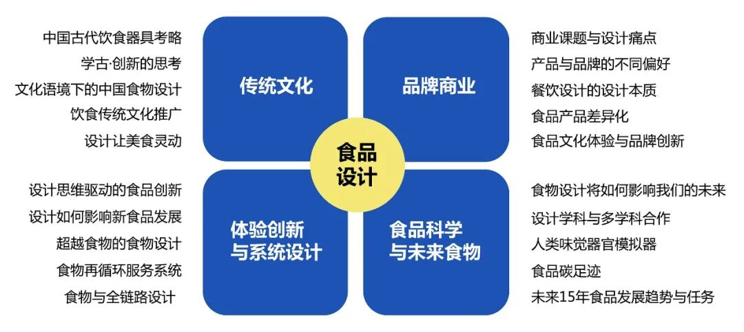 通过食品设计,改变人类与食物在物质层面、生物层面、精神层面、社会层面的面貌,创造出新的饮食体验。包含了食物的产品设计、包装设计、空间设计、品牌设计、信息设计、服务设计、食物观念艺术、食物社交等,在设计学、营养学、人类学、生理学、心理学、自然生态等学科形成综合交叉关系。