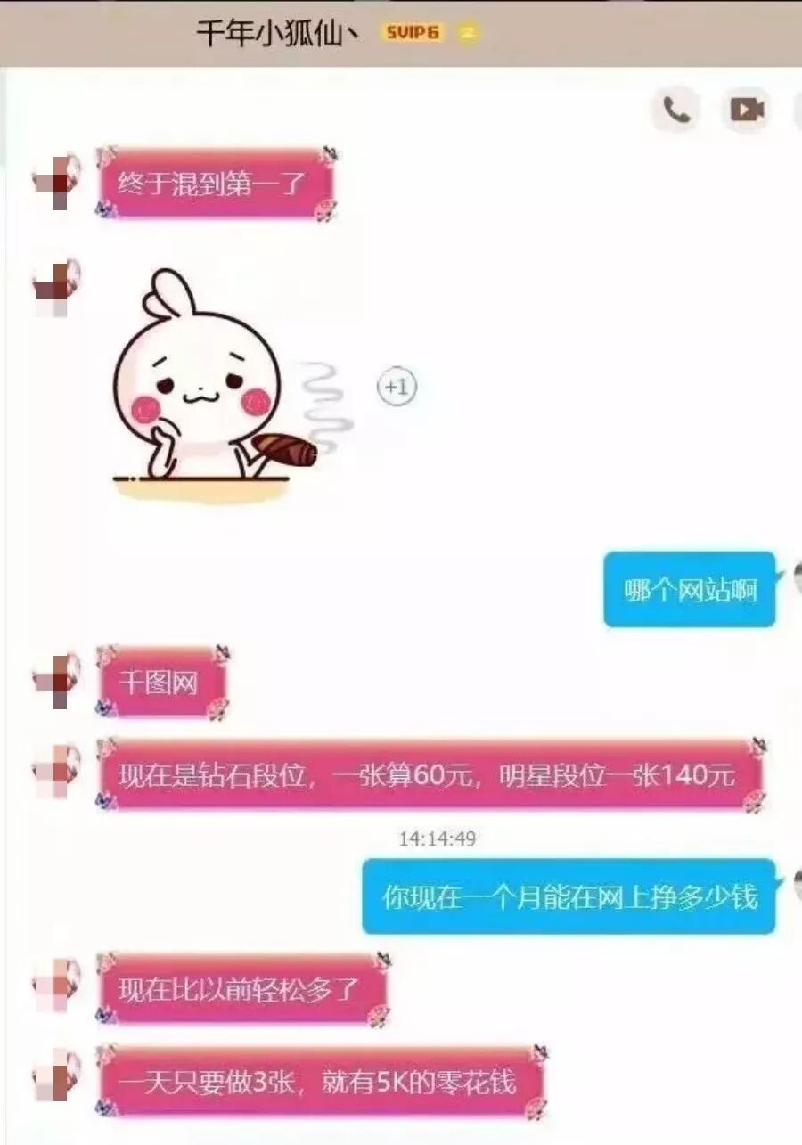 一个现在是千图网钻石段位签约设计师,每天做三张图,一个月就有5k的零花钱。她现在每个月除工资外基本还能有1w-1.5w左右零花钱。(直接百度 千年小狐仙、千图网 第一个就是她)