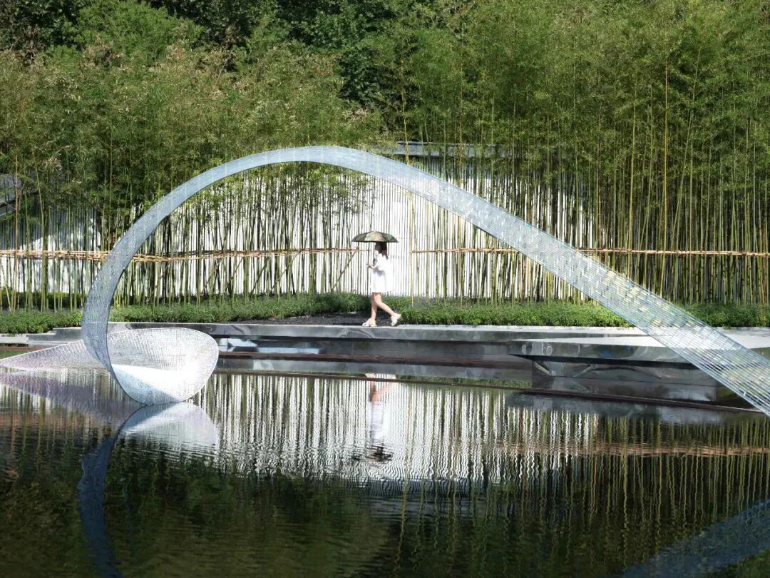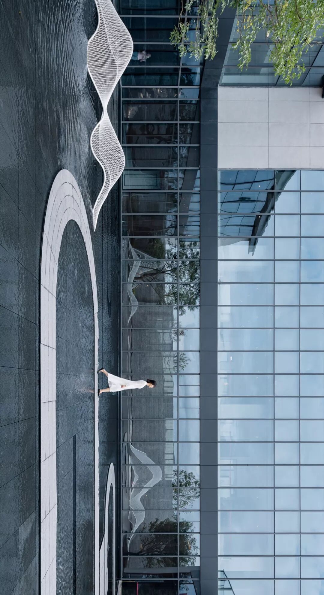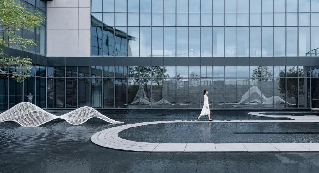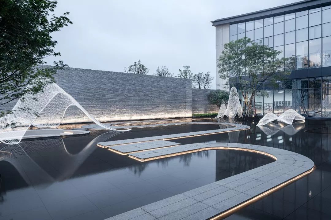 庭中作艺术雕塑,临水自照,是庄周临渊羡鱼,还是今人水中望月?庭中四壁,水波碧影,摇曳生姿,郁郁庭水,皆为般若。