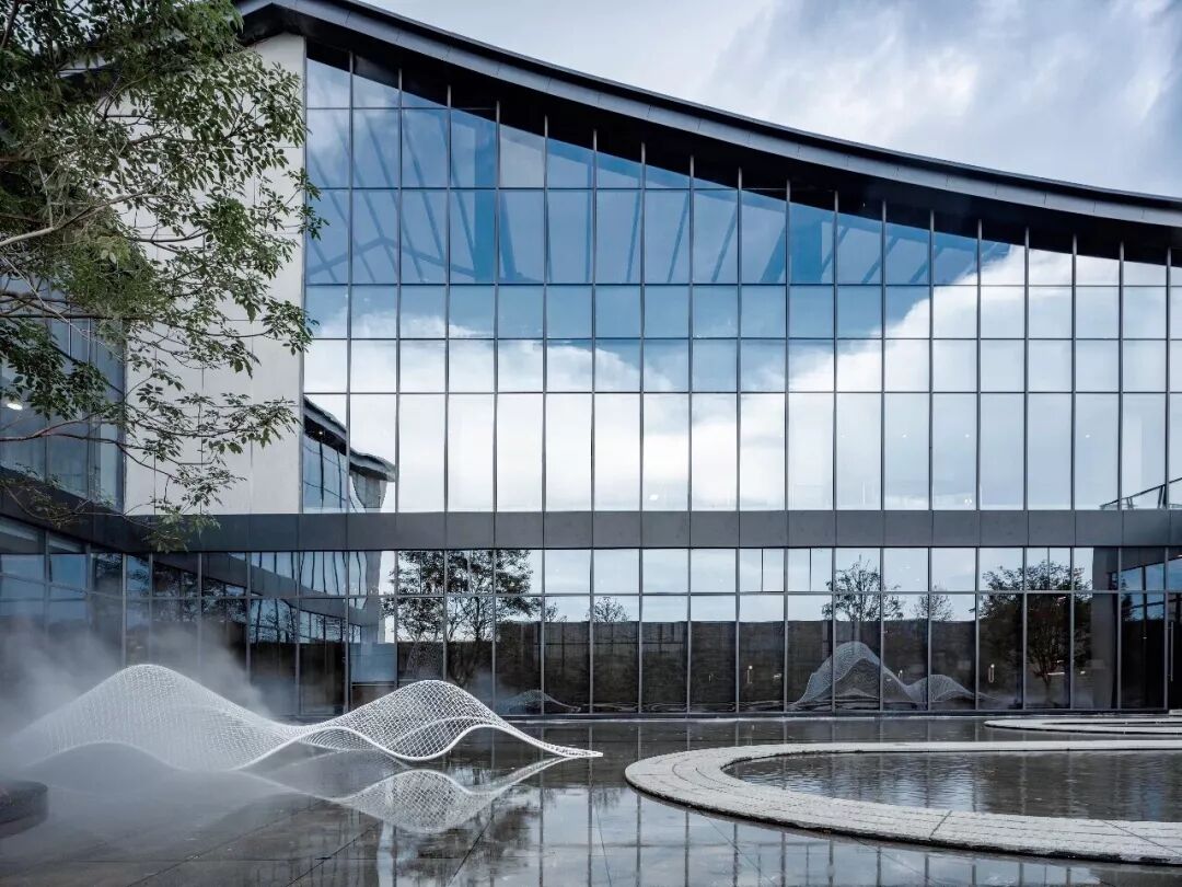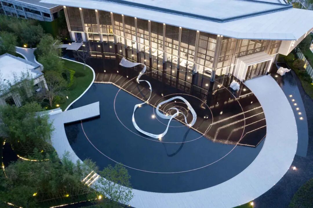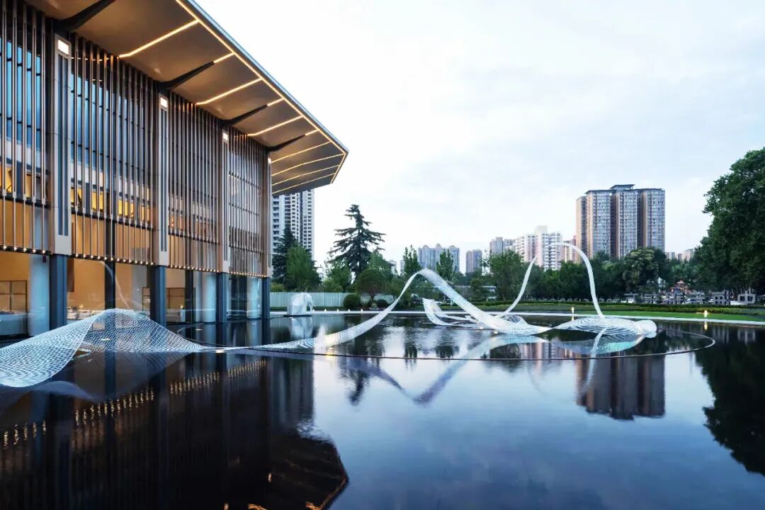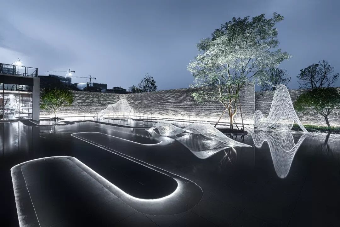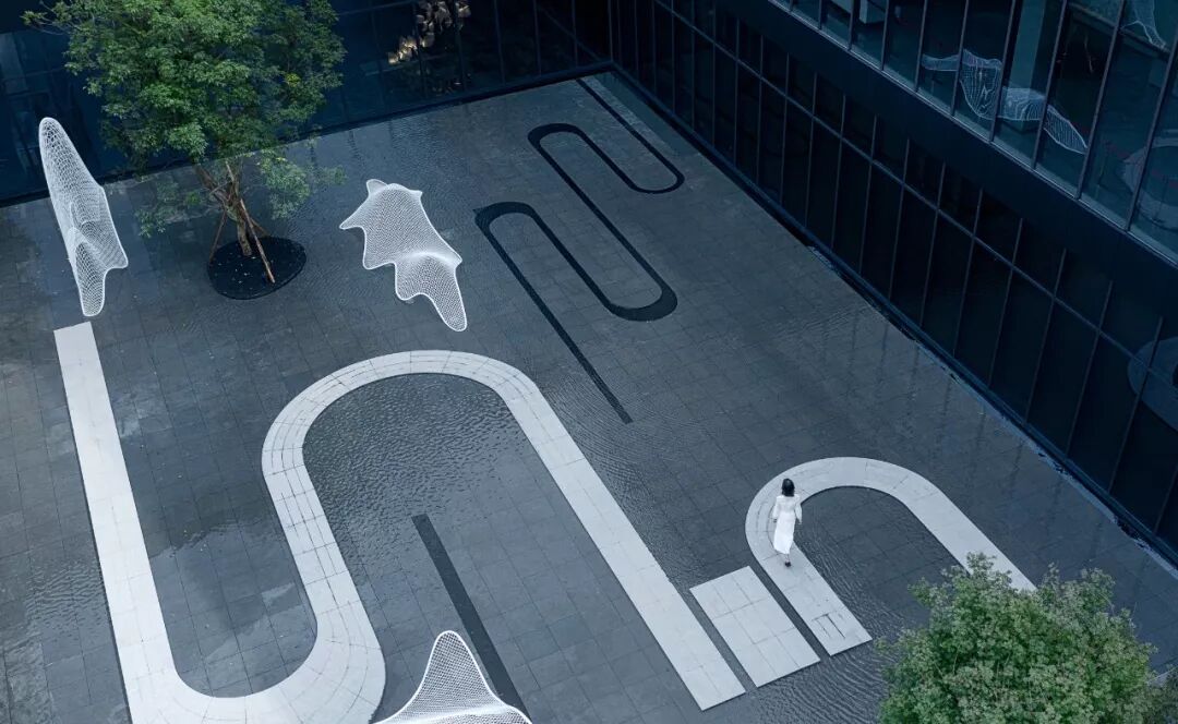 庭中作艺术雕塑,临水自照,是庄周临渊羡鱼,还是今人水中望月?庭中四壁,水波碧影,摇曳生姿,郁郁庭水,皆为般若。
