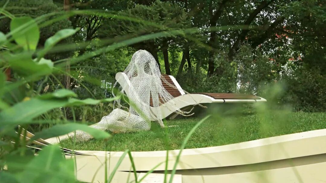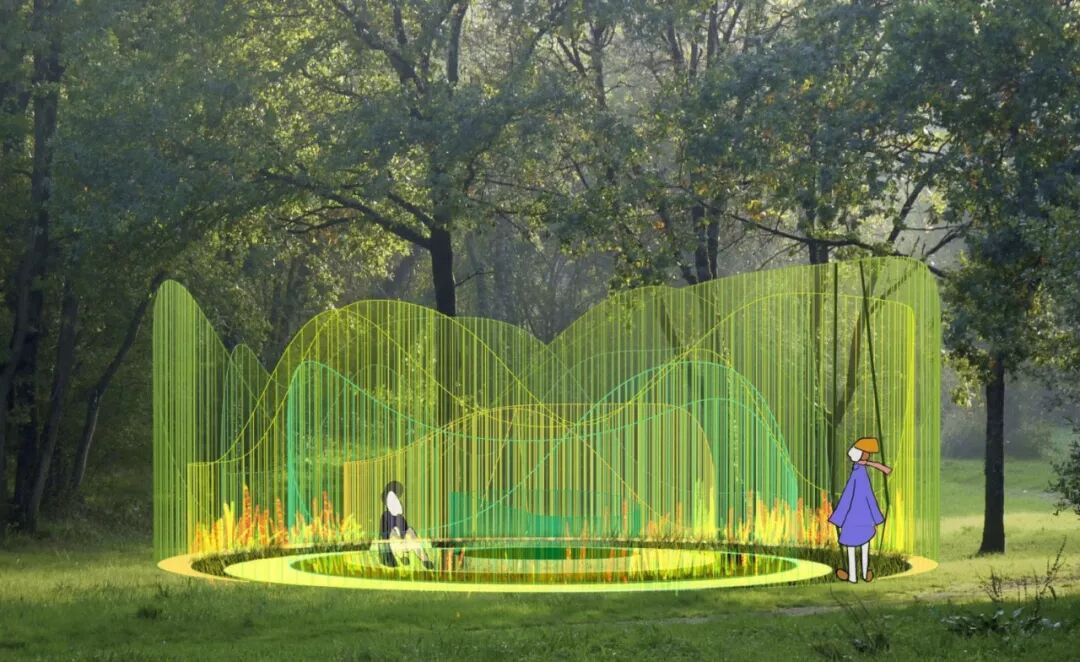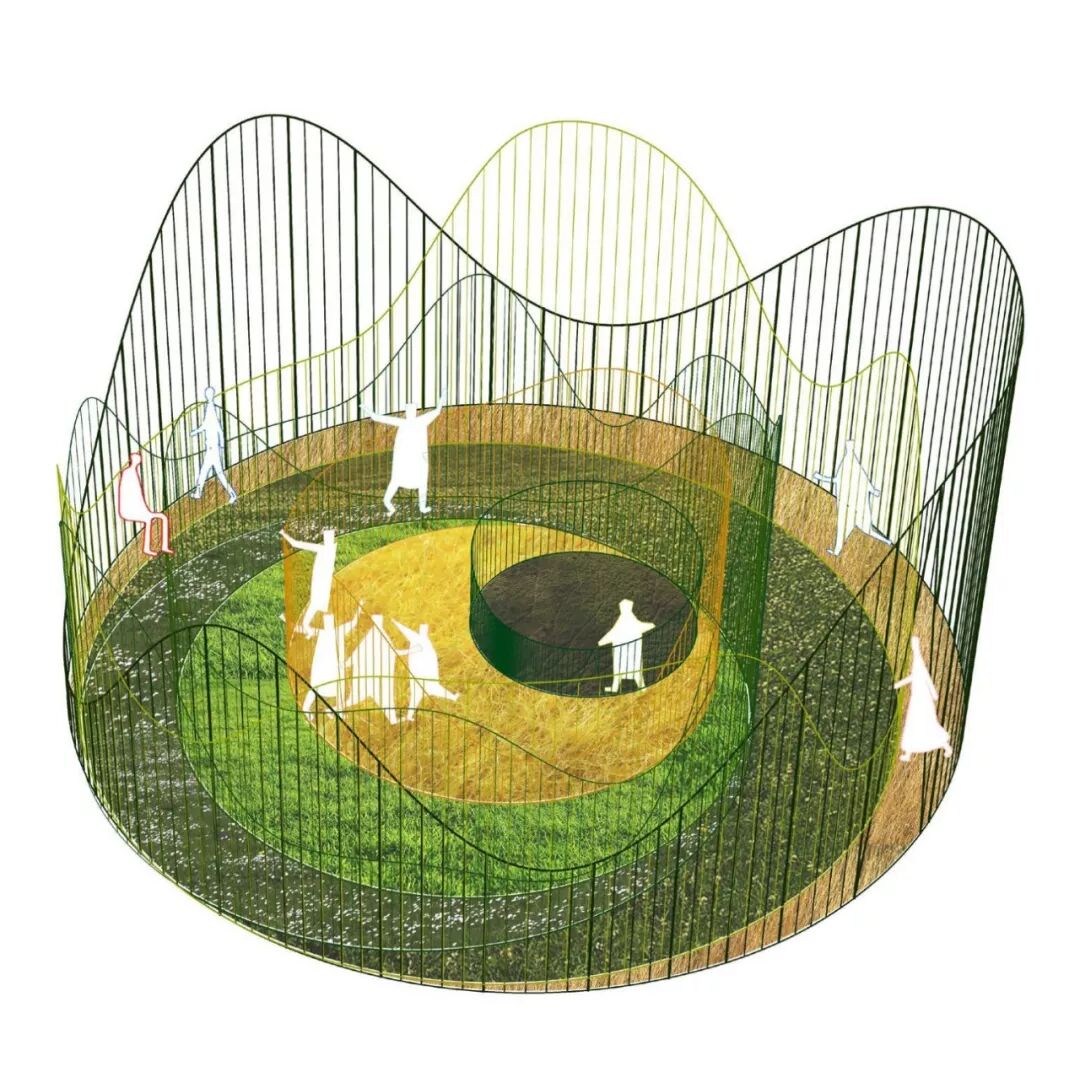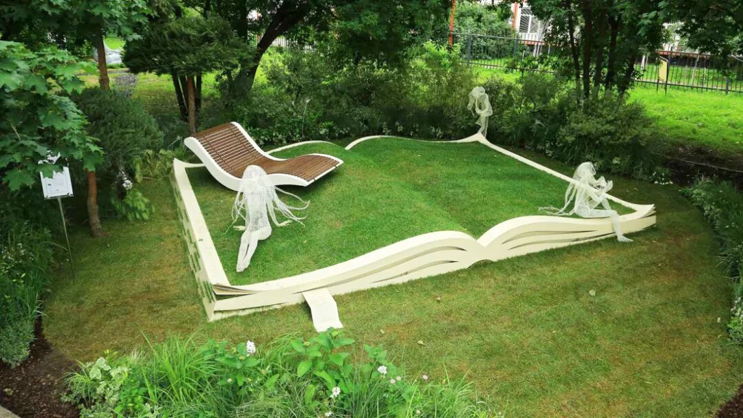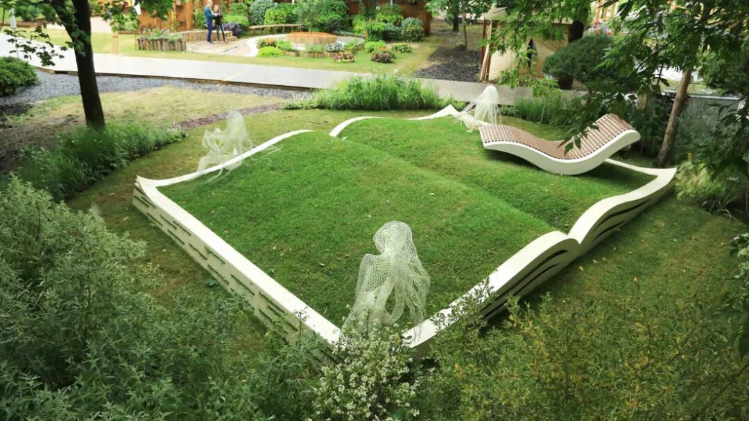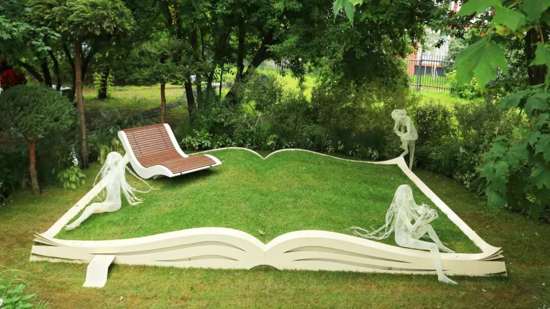 这是一个展示花园,一本书装置,三个角有造型各异的编织雕塑组成,可供参观,休闲娱乐的空间设计。