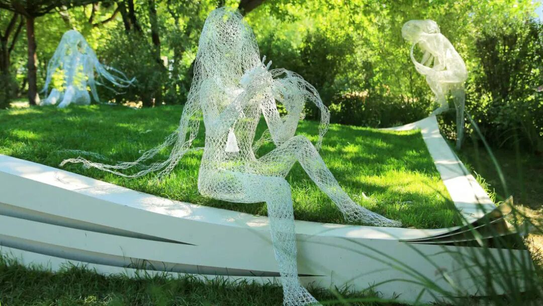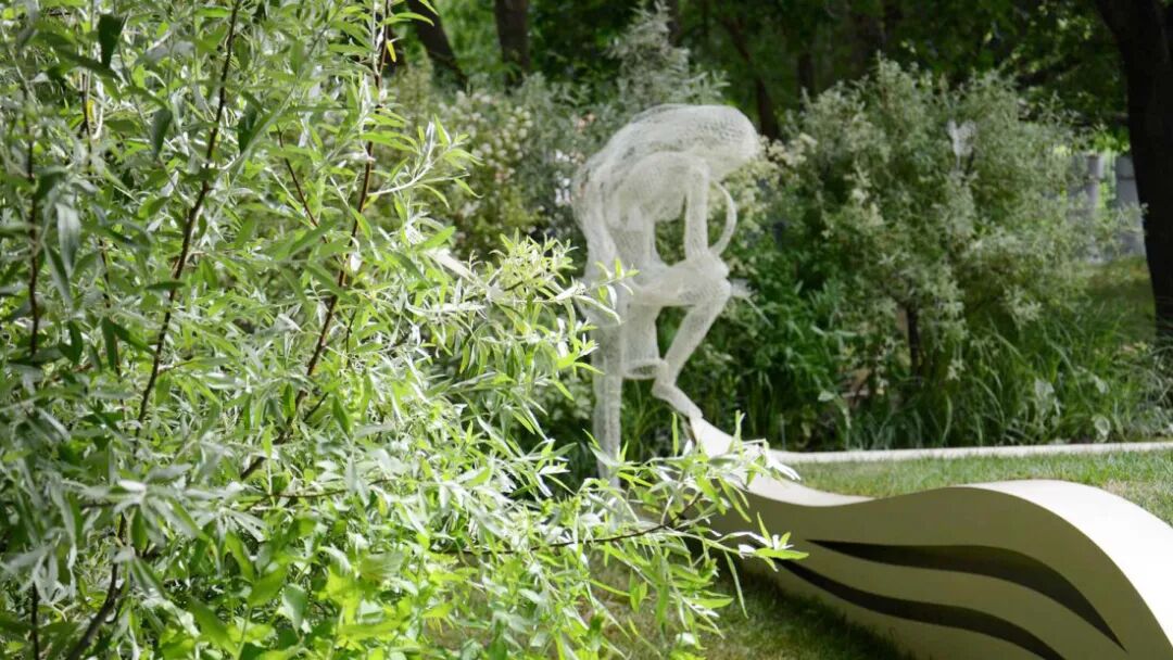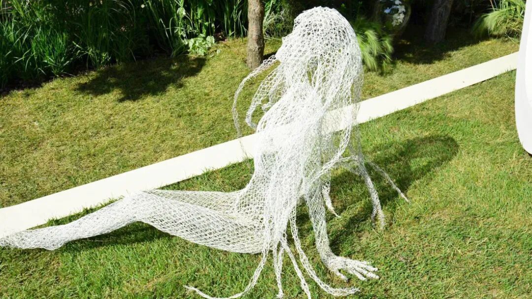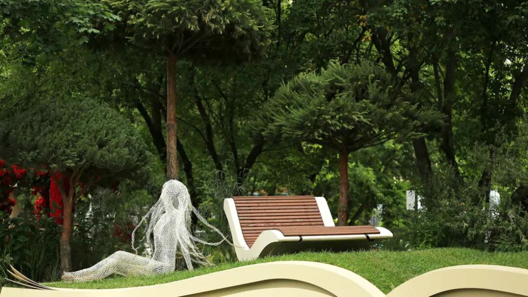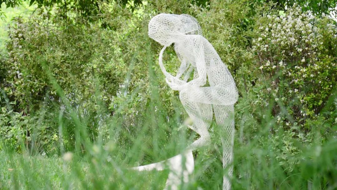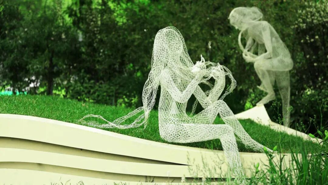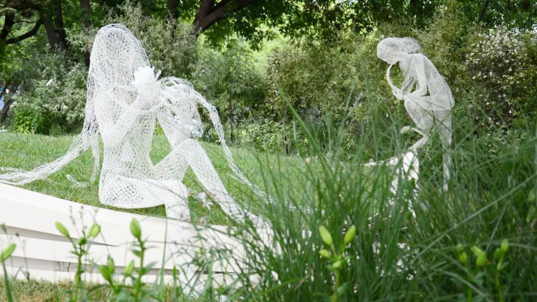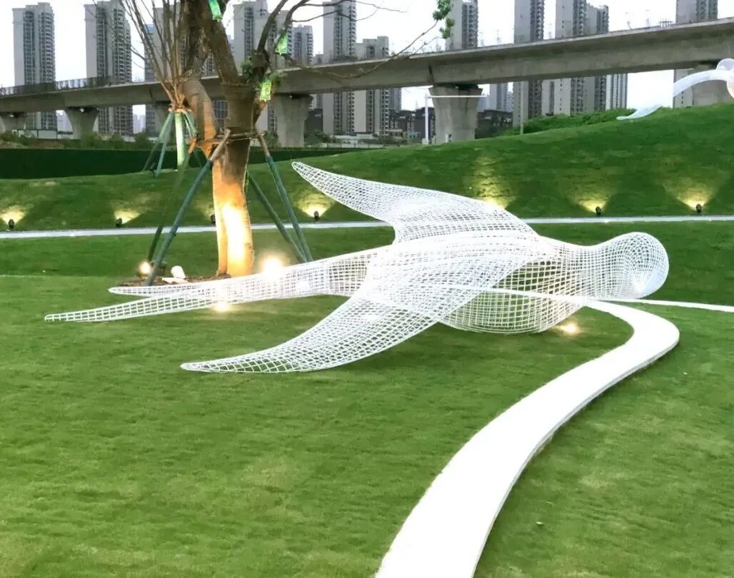 这是一个展示花园,一本书装置,三个角有造型各异的编织雕塑组成,可供参观,休闲娱乐的空间设计。