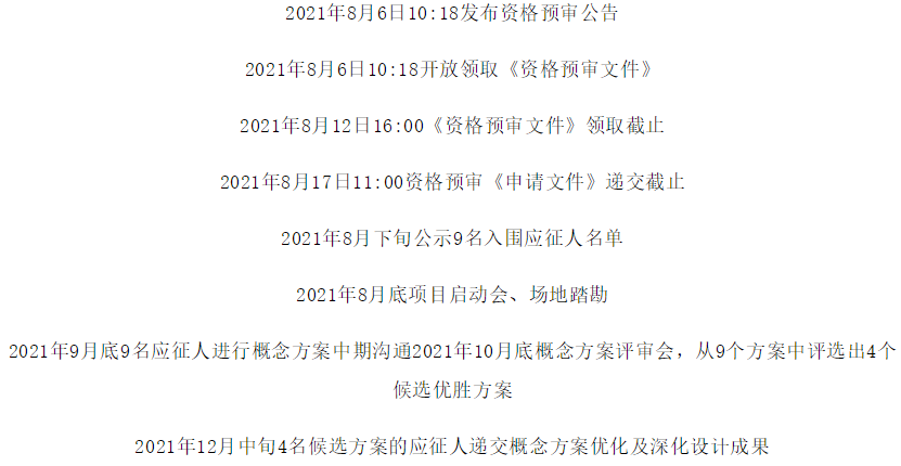 2021年8月24日,相关方面举办了本次概念方案征集的资格预审评审会。经由专家评审,确认9家设计单位入围。