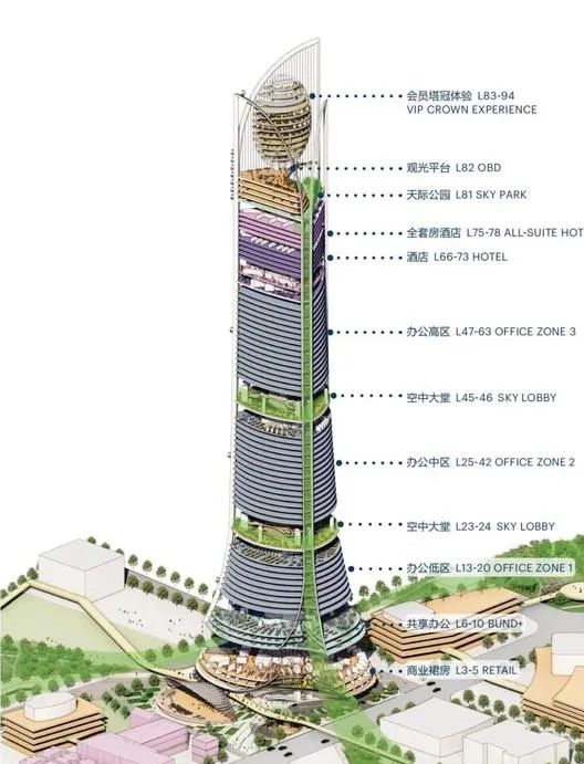 从地块指标来看,此地块总面积仅3.458万平方米,相当小。而容积率高达27.5,是上海开埠以来容积率最高的地块。项目涵盖商业、办公、酒店、观光四种业态,场地狭小,交通组织和业态组织十分复杂。另外,作为480米的摩天楼,建筑造型和空间设计想要有所突破、出彩也甚为不易。
