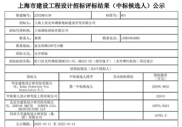 上海虹口区北外滩街道HK321-01、HK321-02(部分地下)(北外滩91街坊)480米高地标项目就在本周完成了项目设计招评标,最终由Kohn Pedersen Fox(KPF)与华东建筑设计研究院(ECADI)联合体成功中标。设计费报价为人民币2.5亿。 此项目方案设计竞赛历时1年有余。