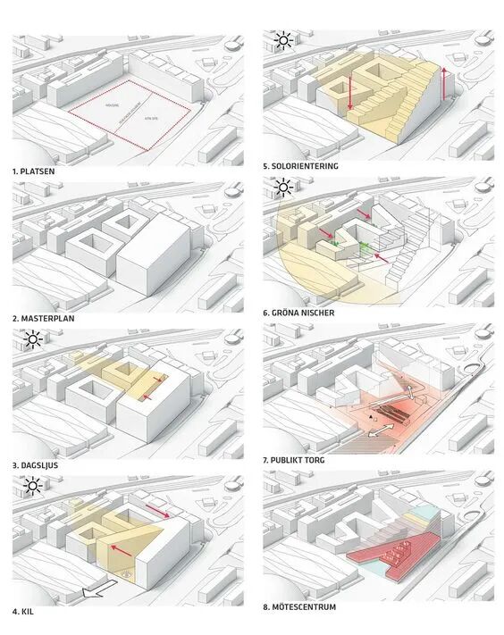 从上帝视角看房子使得现在的建筑很注重宏观的建筑逻辑推演,各种分析图孕育而生,它是建筑设计游戏化最典型的特征——为了满足建筑日照,削掉房子一角;为了建筑内部采光,在房子中间挖个洞;为了把活力还给地面,把房子的裙角抬起来等等操作。而真实的效益,则由一个个箭头简单粗暴地解释掉。