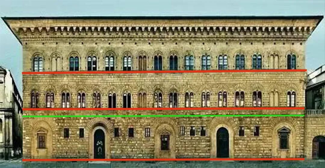 此外,二维图像的几何逻辑跟实际空间使用有时候也会产生反差。有些建筑师为了追求建筑立面的美感,他们会先保证建筑立面的图像比例规律——尽管建筑内部的实际空间并不会根据建筑立面来建造。这就造成了形式与功能的脱节,从而构成两套语言系统。比如,美帝奇府邸立面(一层皮的屏风式建筑)的三根横线在图纸上是符合比例和美学的,但这并不是楼板的分界线——尽管它给了人们产生了这种错觉。
