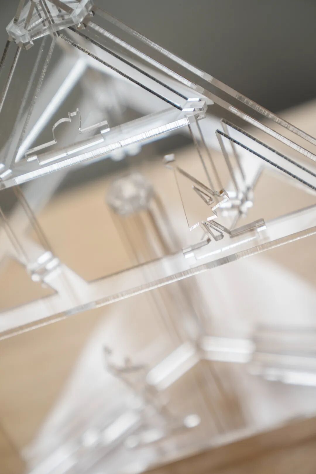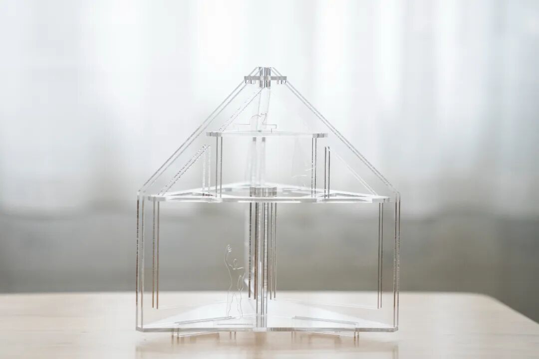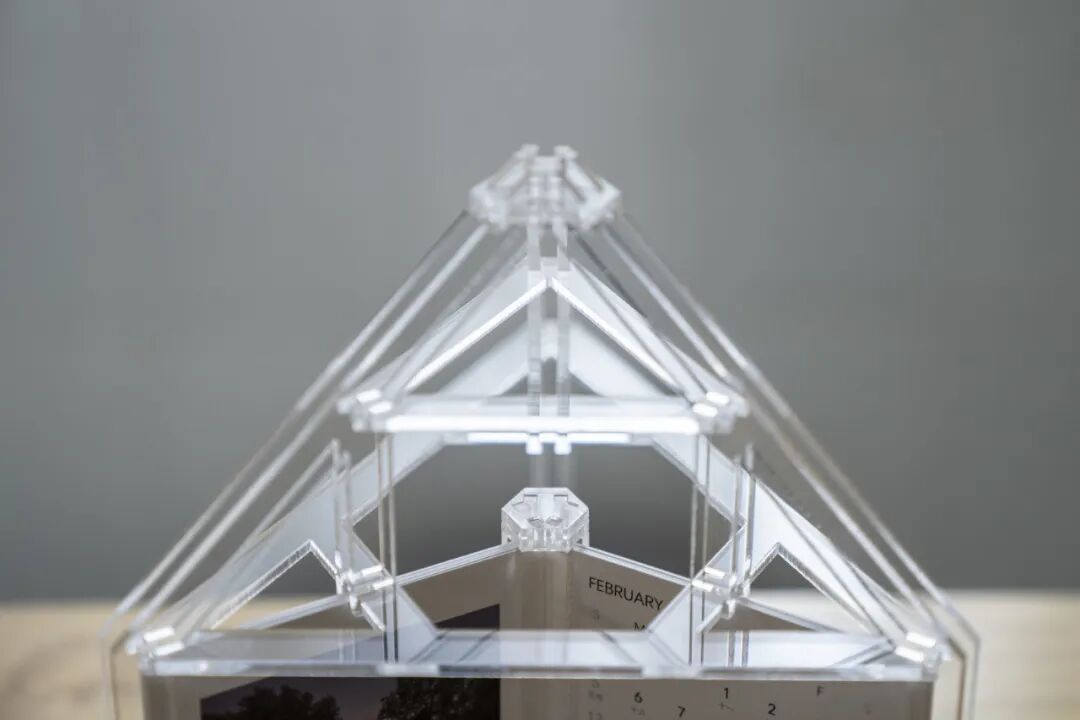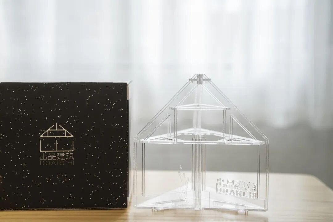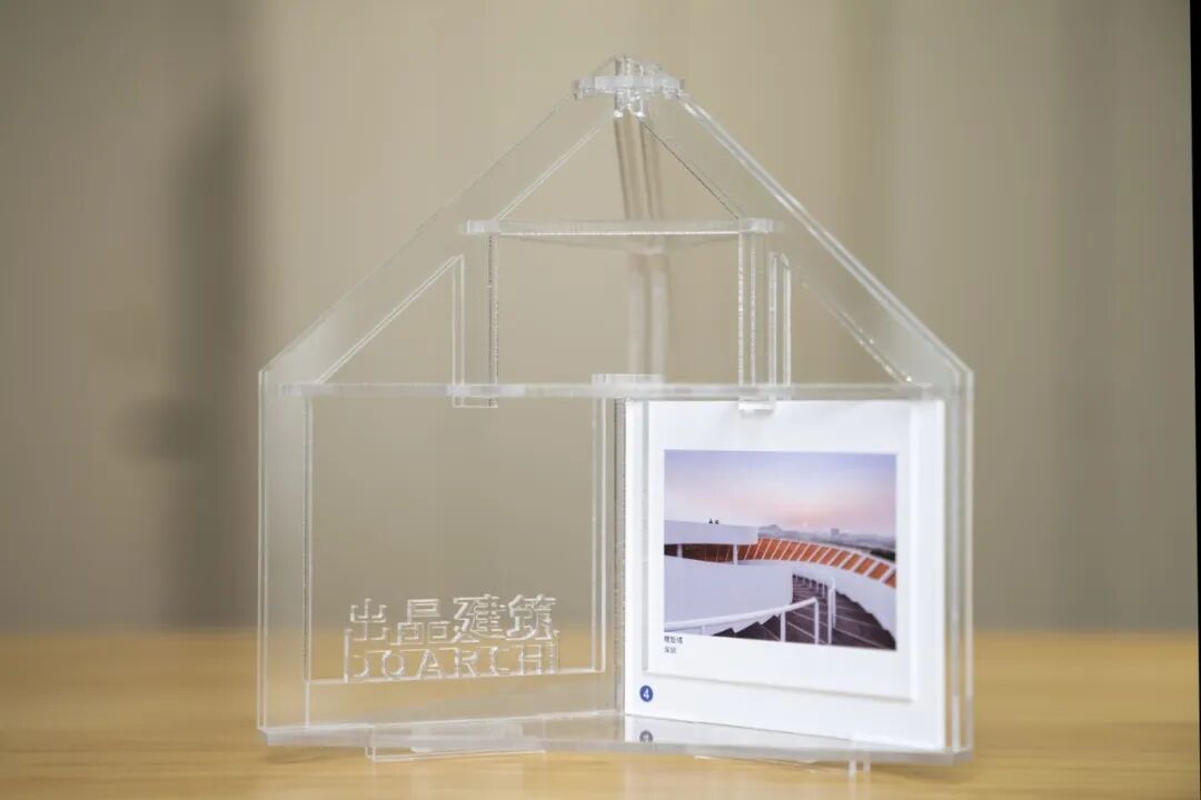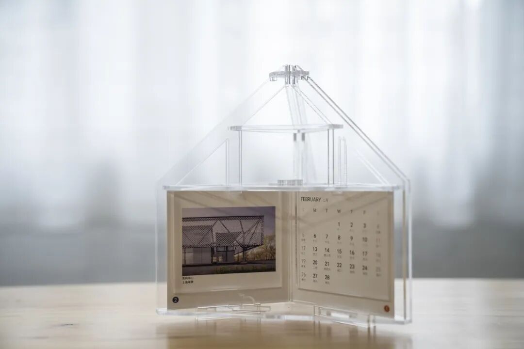 台历架是出品建筑logo的三维化,里面抽象了“出品”两个字,也像一个小房子,或者说小亭子更合适。
