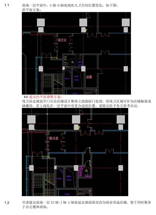 如:1.1(序号)商场一层平面中,x轴—x轴处的卫生间位置有待优化,如下图: