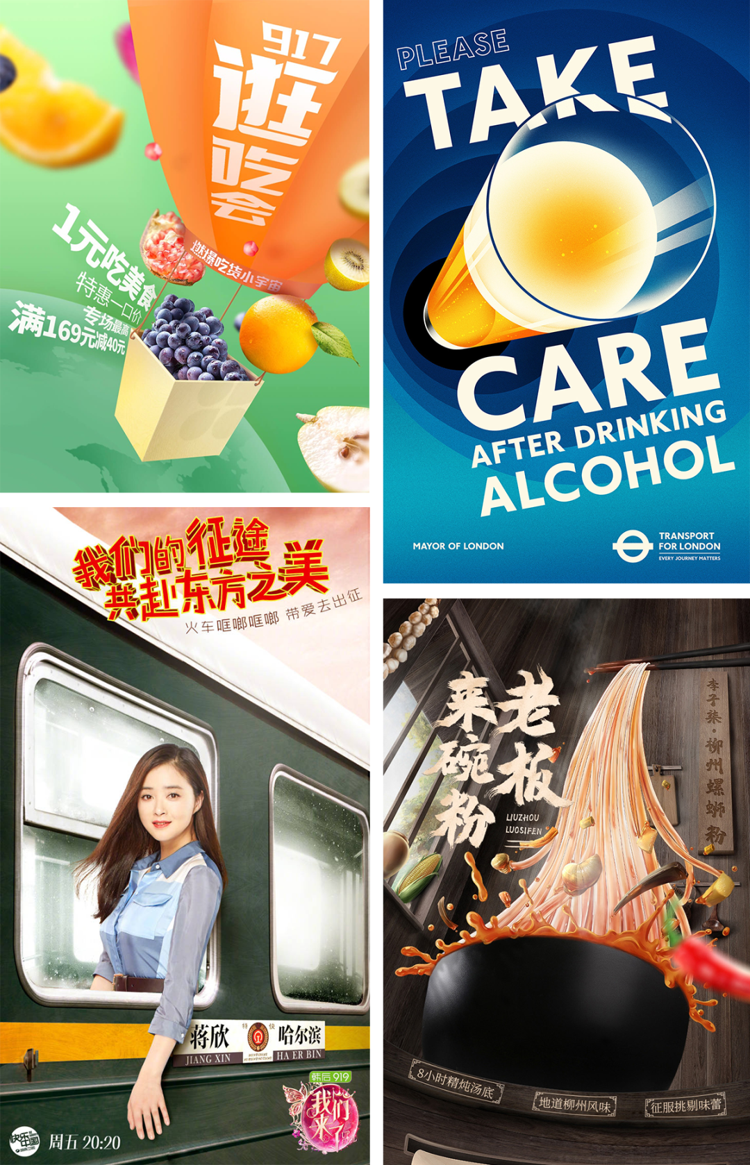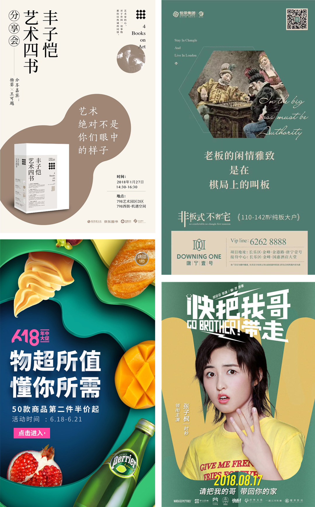 对比来看,图版率高的海报给人的视觉感受更加活跃,当然两者的视觉表现都是可取的,只是通过案例,我们又多了一个解决作品沉闷的方法:可以通过改变图片所占整体面积的大小进行解决。