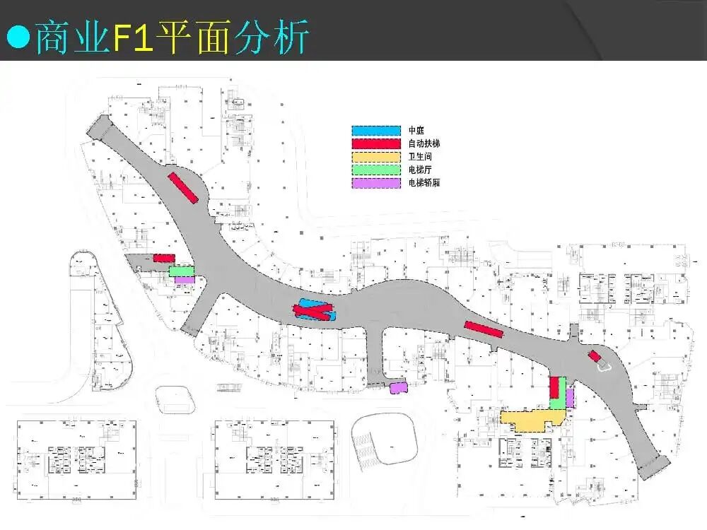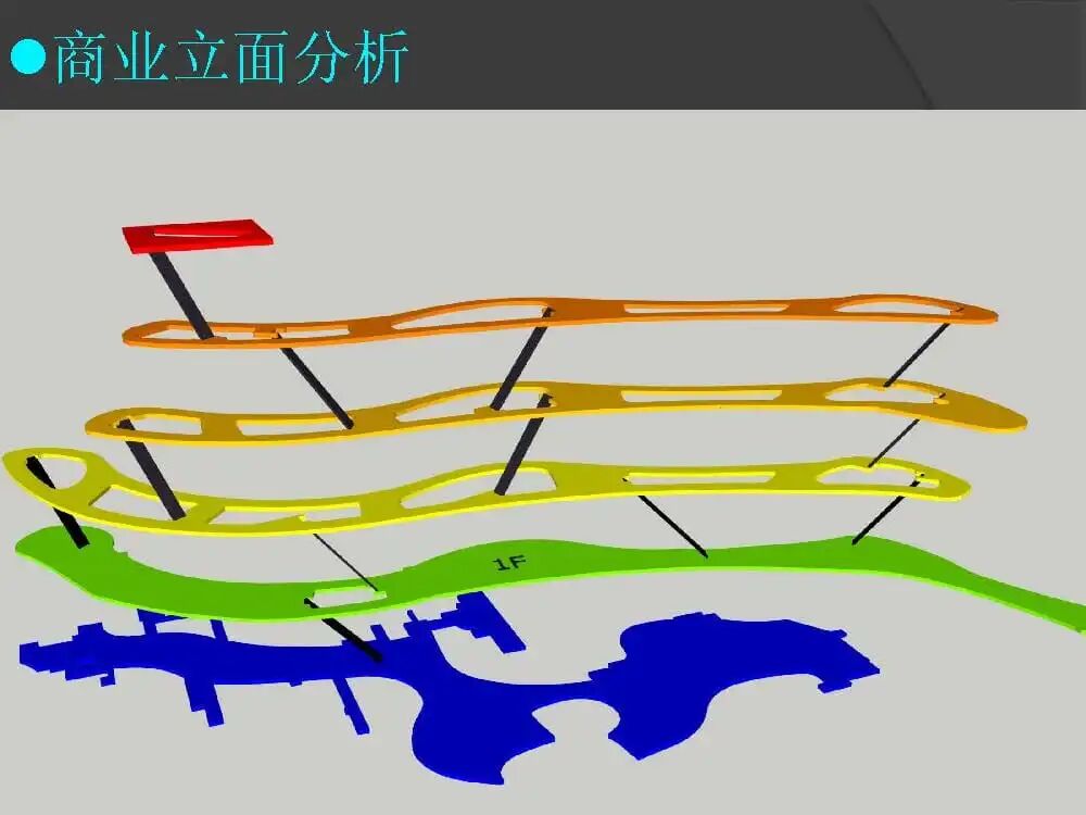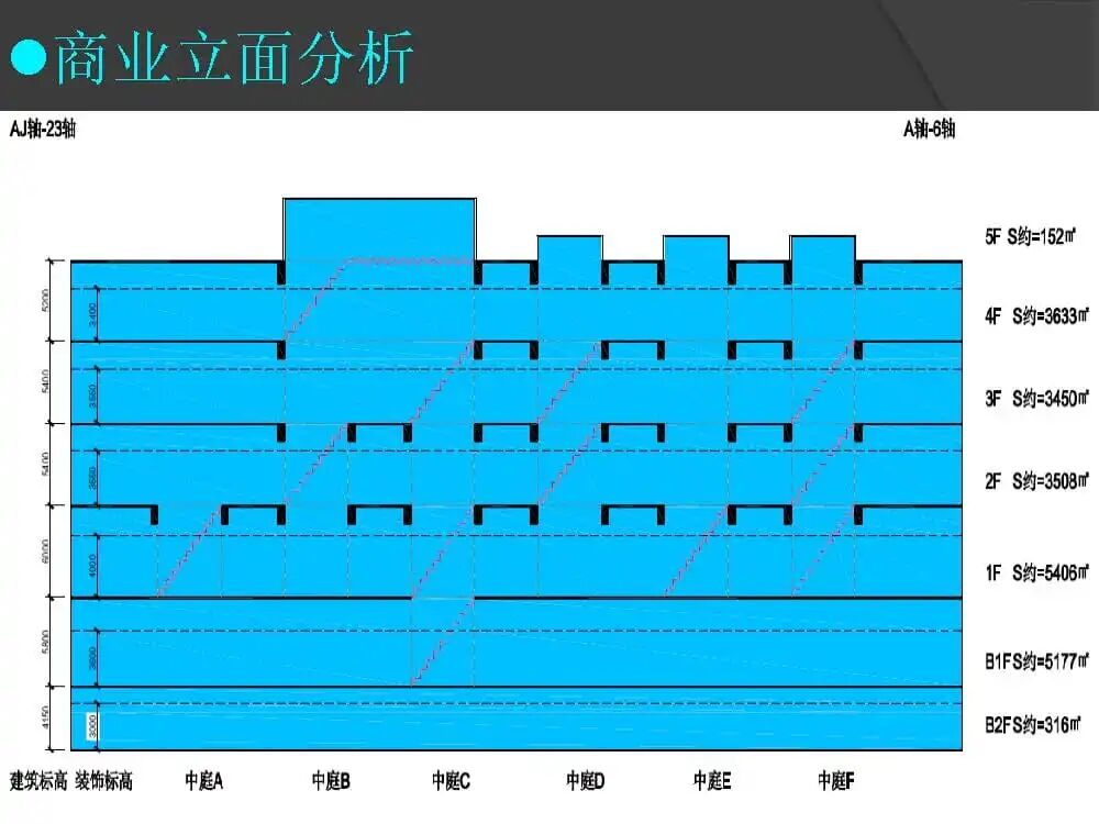 c、立面分析:各楼层的垂直交通流线、中庭分布关系;