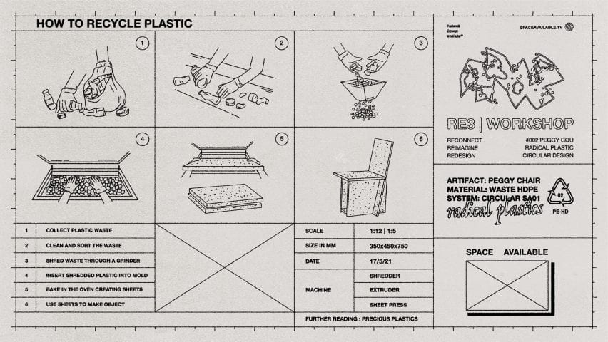 Space Available是一个创意平台,由设计师、艺术家、科学家和环保主义者组成,旨在建设可持续发展的未来。他们以可持续和再生为原则做了一些生物创新、废料的彻底回收等项目。如图为Space Available与Peggy Gou合作制造的椅子。